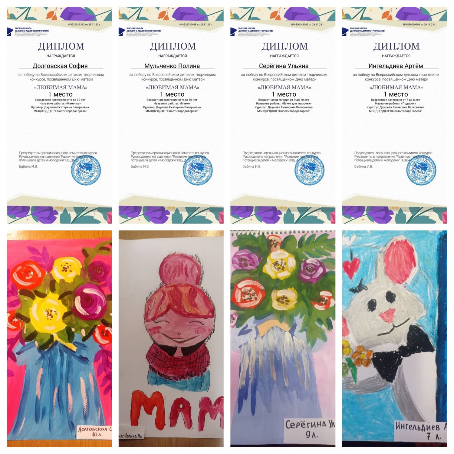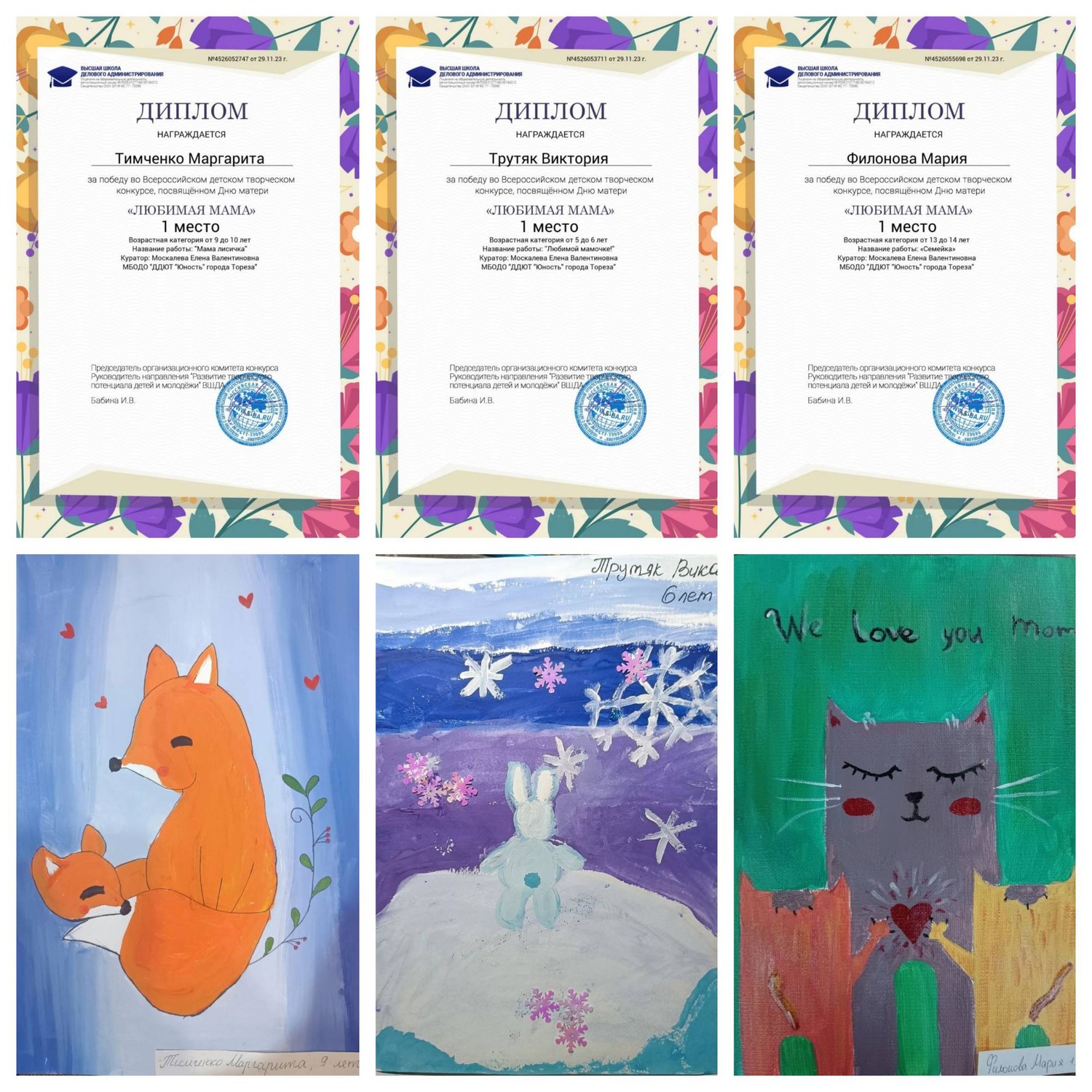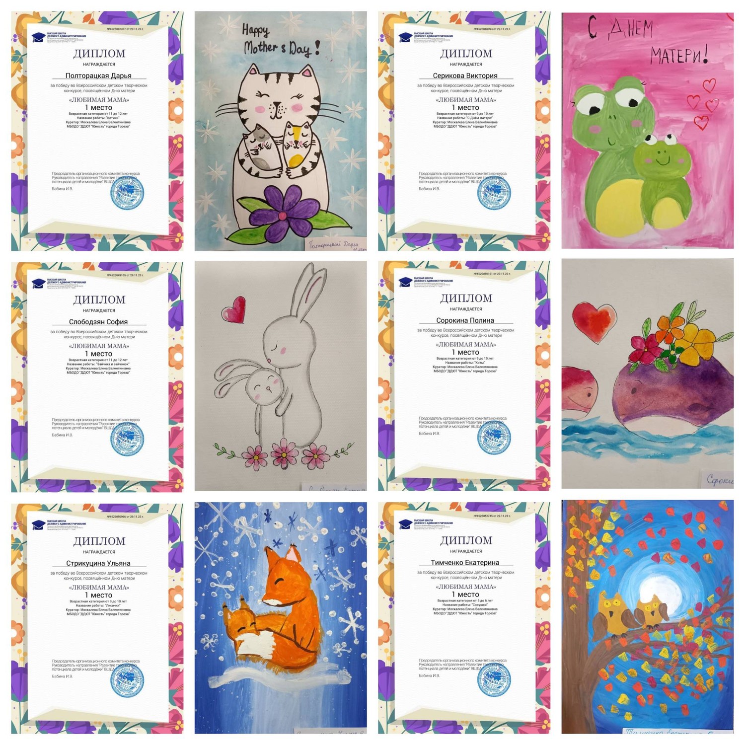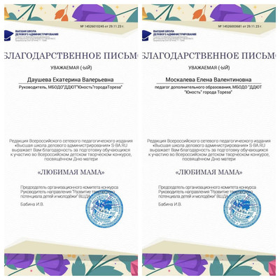 С 23 по 28 ноября обучающиеся ТО «Живопись и графика» (педагог Даушева Е.В.) и «Школа красоты» (педагог Москалева Е.В.) приняли участие во Всероссийском детском творческом конкурсе, посвящённого Дню матери «Любимая мама» (г. Екатеринбург, Высшая школа делового администрирования). Что таится в слове «мама»? Итоги конкурса – 19 первых, 5 вторых и 2 третьих места! 1-е места - Серёгина Ульяна, Ингильдиев Артём, Долговская София, Мульченко Полина; 2-е места – Высоцкая Арина, Ковредова Вероника, Константинова Настя, Мещерякова Эвелина, 3-и места – Припасаева София, Плахтюк Таисия. Образцовый художественный коллектив «Школа красоты» (педагог Москалева Е.В.) – 15 первых и 1 второе место: 1-е места – Бубнова Алиса, Васильева Кира, Гомонова Мария, Ермолова Маргарита, Коршикова Карина, Подрезова Мария, Полторацкая Дарья, Серикова Виктория, Слободзян София, Сорокина Полина, Стрикуцина Ульяна, Тимченко Маргарита, Тимченко Екатерина, Трутяк Виктория, Филонова Мария; 2-е место – Байкова Мария. Педагоги награждены благодарственными письмами. Молодцы!