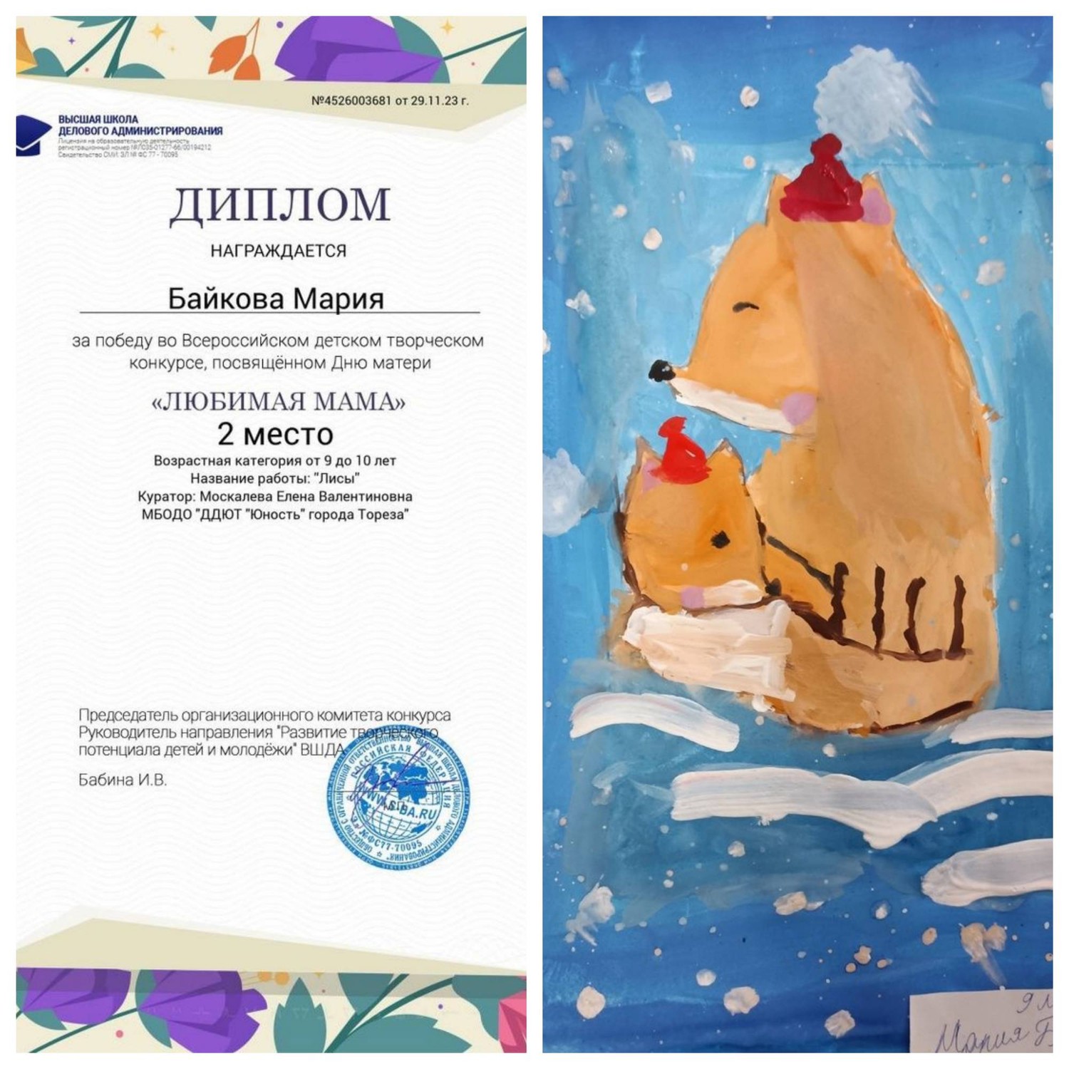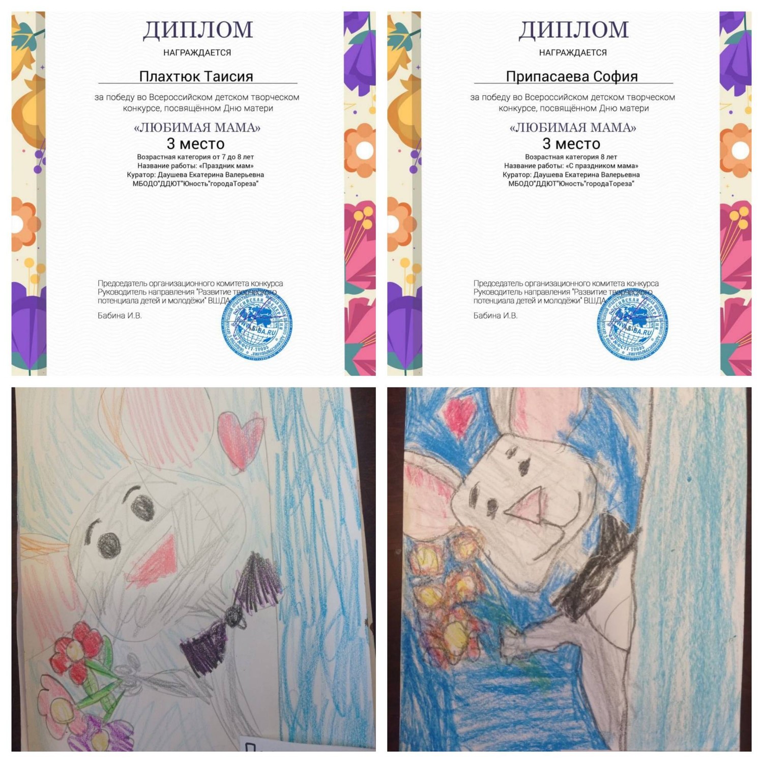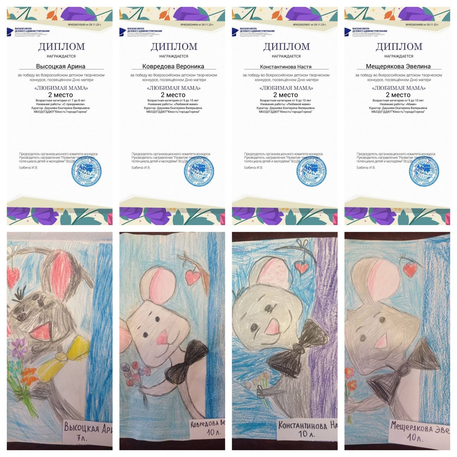 С 23 по 28 ноября обучающиеся ТО «Живопись и графика» (педагог Даушева Е.В.) и «Школа красоты» (педагог Москалева Е.В.) приняли участие во Всероссийском детском творческом конкурсе, посвящённого Дню матери «Любимая мама» (г. Екатеринбург, Высшая школа делового администрирования). Что таится в слове «мама»? Итоги конкурса – 19 первых, 5 вторых и 2 третьих места! 1-е места - Серёгина Ульяна, Ингильдиев Артём, Долговская София, Мульченко Полина; 2-е места – Высоцкая Арина, Ковредова Вероника, Константинова Настя, Мещерякова Эвелина, 3-и места – Припасаева София, Плахтюк Таисия. Образцовый художественный коллектив «Школа красоты» (педагог Москалева Е.В.) – 15 первых и 1 второе место: 1-е места – Бубнова Алиса, Васильева Кира, Гомонова Мария, Ермолова Маргарита, Коршикова Карина, Подрезова Мария, Полторацкая Дарья, Серикова Виктория, Слободзян София, Сорокина Полина, Стрикуцина Ульяна, Тимченко Маргарита, Тимченко Екатерина, Трутяк Виктория, Филонова Мария; 2-е место – Байкова Мария. Педагоги награждены благодарственными письмами. Молодцы!
