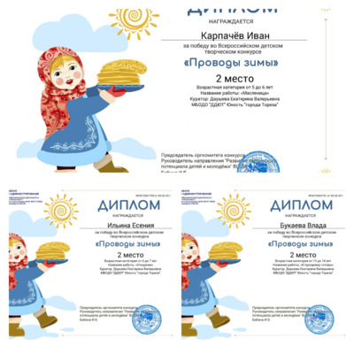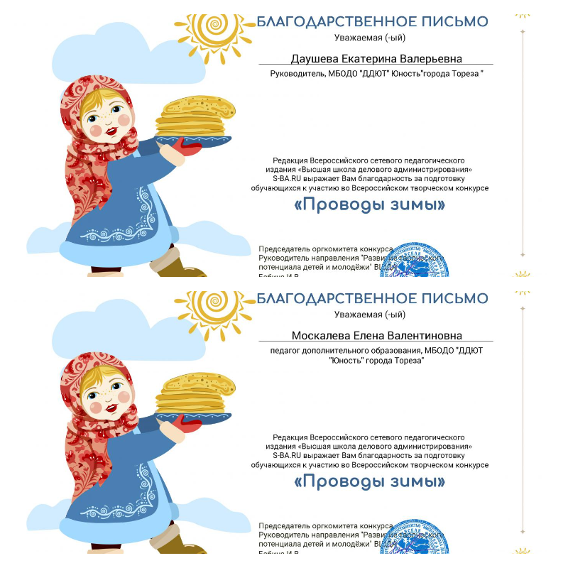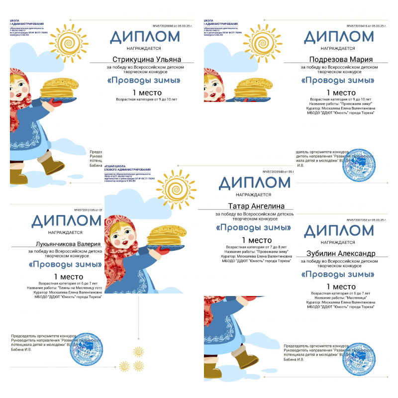 В марте обучающиеся ТО «Школа красоты» (педагог Москалева Е.В.) и «Живопись и графика» (педагог Даушева Е.В.) приняли участие во Всероссийском детском творческом конкурсе «Проводы зимы» (ВШДА, г. Екатеринбург). Итоги конкурса - 14 первых, 3 вторых и 3 третьих места! Образцовый художественный коллектив «Школа красоты»- 5 первых мест: 1-е места – Зубилин Александр, Лукьянчикова Валерия, Подрезова Мария, Стрикуцина Ульяна, Татар Ангелина. Народный художественный коллектив «Живопись и графика» – 9 первых, 3 вторых и 3 третьих места: 1-е места – Ананченко Василиса, Березюк Мирослава, Биць Наталья, Бутвина Алина, Данилина Иванна, Денисюк Никита, Мамедов Эльдар, Мельник София, Хорошун Ульяна. 2-е место – Букаева Влада, Ильина Есения, Карпачёв Иван. 3-е место – Доброва Арина, Колпакова Василиса, Сигитов Николай. Педагоги награждены благодарственными письмами. Молодцы! Так держать!
