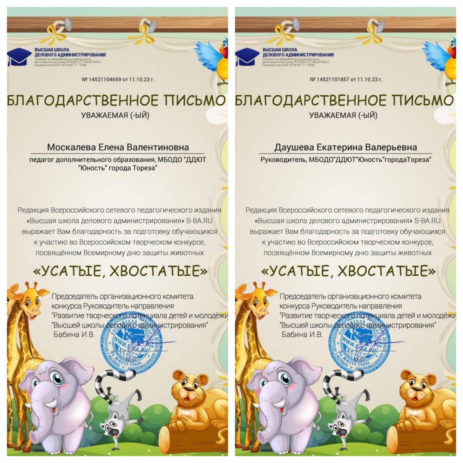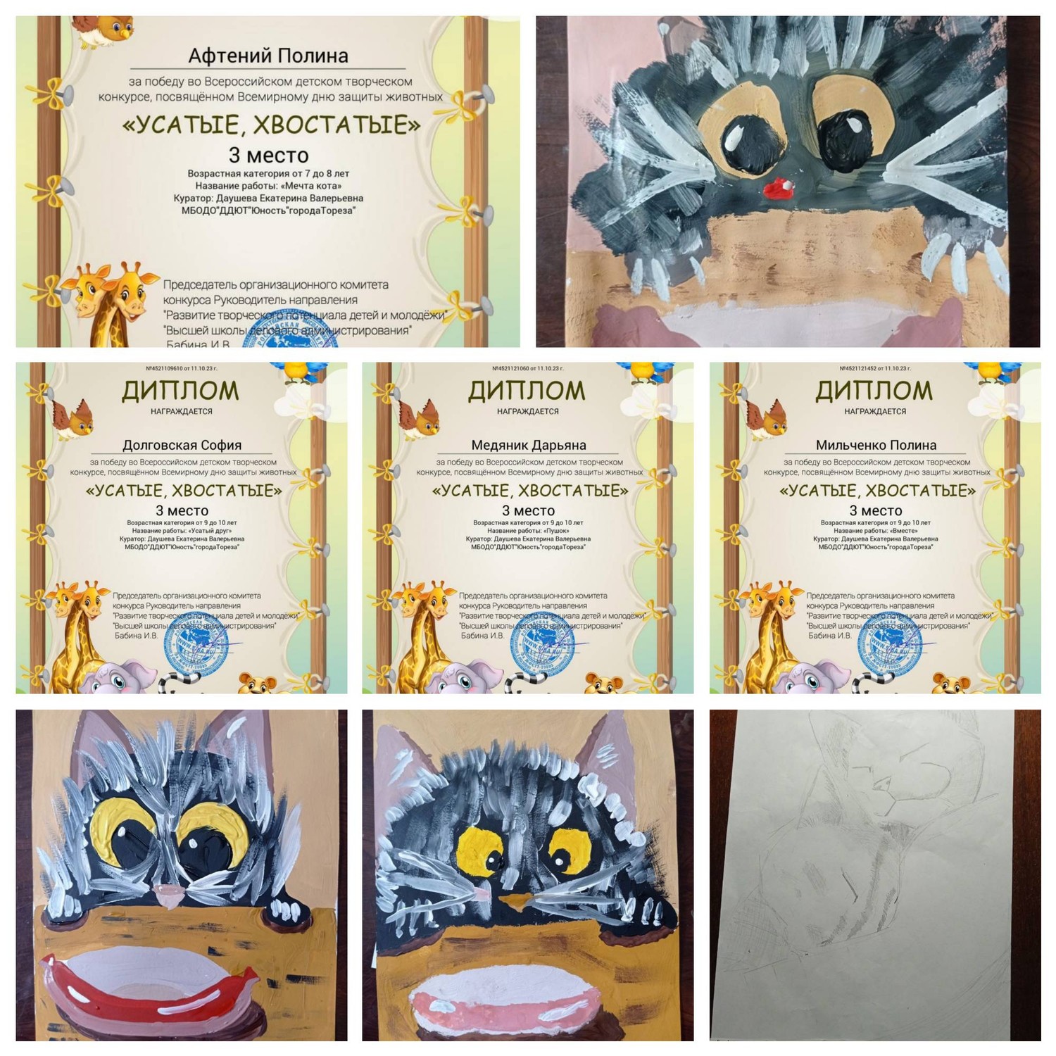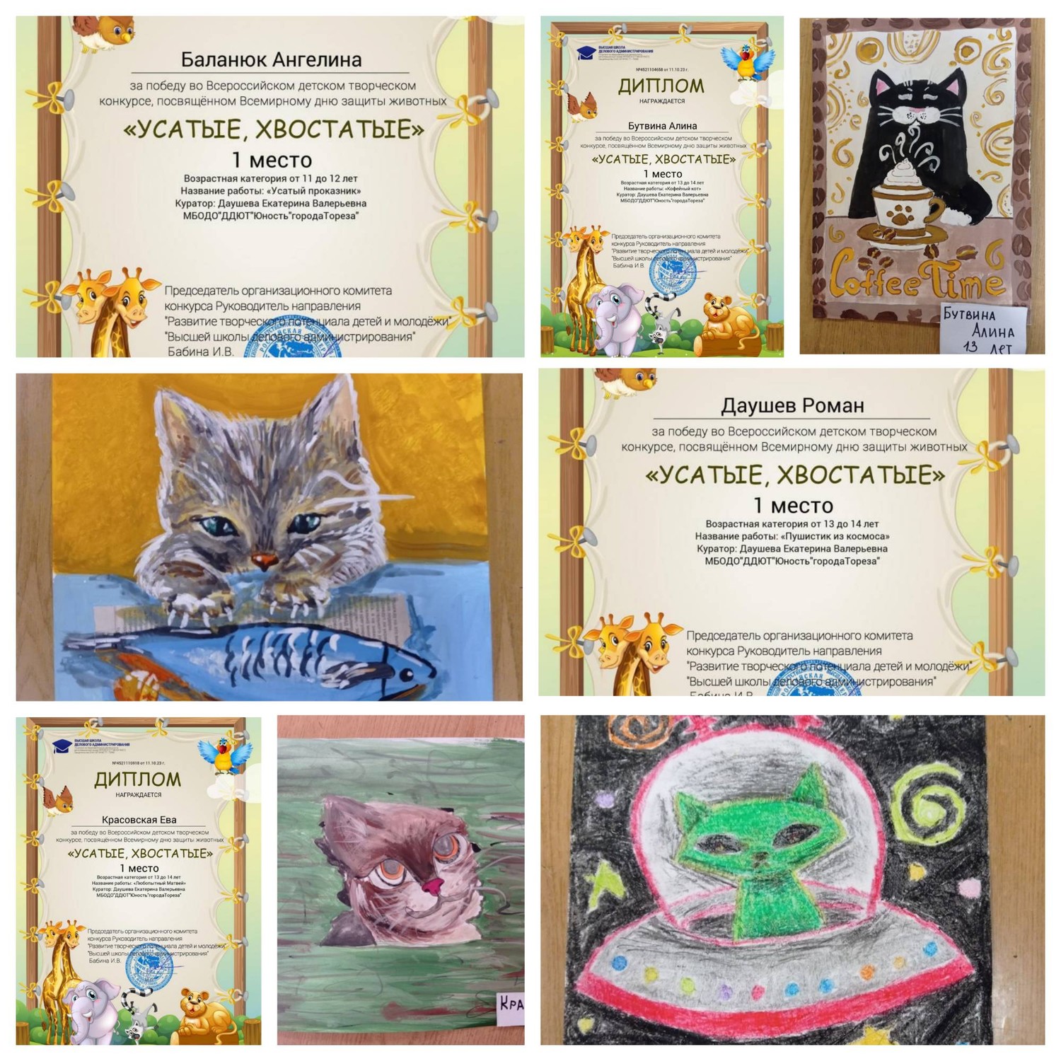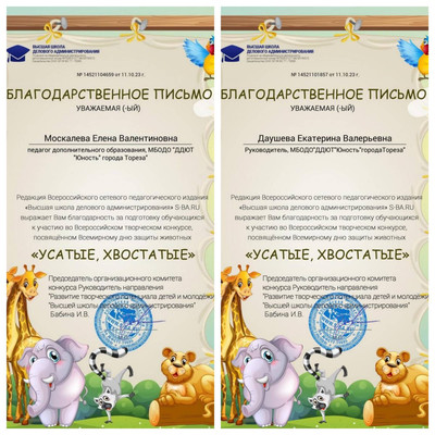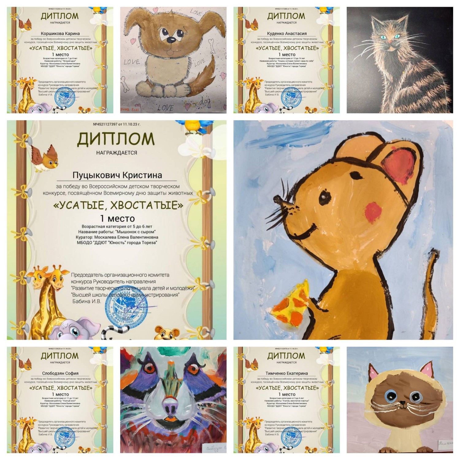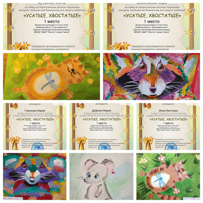 4 октября по всему миру отмечается День защиты животных. Зародился этот праздник почти век назад, в 1925 году в Германии. Дату выбрали не случайно. 4 октября - день памяти католического святого Франциска Ассизкого, покровителя природы и зверей, который, по легендам, умел разговаривать с животными. С 5 по 10 октября обучающиеся МБОДО «ДДЮТ «Юность» приняли участие во Всероссийском детском творческом конкурсе, посвящённом Всемирному дню защиты животных «Усатые, хвостатые!». Основные цели и задачи Конкурса: • всестороннее содействие развитию детского изобразительного и декоративно прикладного творчества; • воспитание бережного отношения к животным; • предоставление участникам возможности в состязательной форме развить и продемонстрировать свои творческие способности. Наши результаты – 15 первых, 3 вторых, 4 третьих мест! Образцовый художественный коллектив «Школа красоты» (педагог Москалева Е.В.): 11 первых мест – Иким Виктория, Дуброва Мария, Пуцыкович Кристина, Бутвина Алина, Васильева Кира, Гомонова Мария, Кожекин Тихомир, Коршикова Карина, Куденко Анастасия, Слободзян София, Тимченко Екатерина. Народный художественный коллектив «Живопись и графика» (педагог Даушева Е.В.) – 4 первых, 3 вторых и 4 третьих: 1-е места – Баланюк Ангелина, Бутвина Алина, Даушев Роман, Красовская Ева; 2-е места – Быкадорова Варвара, Гатаулина София, Серёгина Ульяна; 3-и места – Афтений Полина, Долговская София, Медяник Дарьяна, Мульченко Полина. Руководители награждены благодарственными письмами. Поздравляем всех участников и руководителей с отличными результатами!