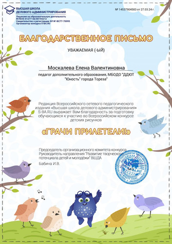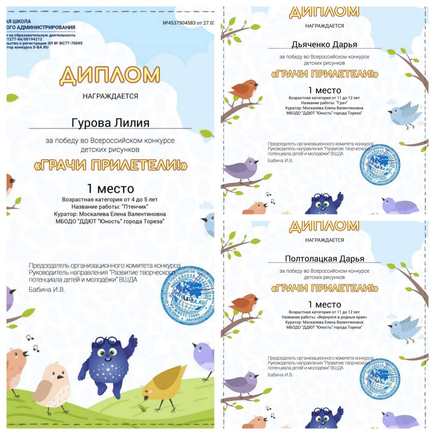 С 21 по 26 марта 2024 обучающиеся образцового художественного коллектива «Школа красоты» (педагог Москалева Е.В.) МБОДО «ДДЮТ «Юность» приняли участие во Всероссийском конкурсе детских рисунков «Грачи прилетели!» (ВШДА г. Екатеринбург). Весна входит в свои права! А что происходит весной? Правильно, возвращаются перелётные птицы! Самыми первыми, во второй половине марта, возвращаются грачи, а потом уже вслед за ними в апреле и мае возвращаются жаворонки, зяблики, скворцы и многие другие пернатые друзья. Основные цели и задачи Конкурса: • всестороннее содействие развитию детского изобразительного и декоративно-прикладного творчества; • предоставление участникам возможности в состязательной форме развить и продемонстрировать свои творческие способности; Итоги конкурса – 3 первых места! 1-е место – Гурова Лилия, Дьяченко Дарья, Полторацкая Дарья. Педагог награждена благодарственным письмом. Поздравляем! Желаем творческих успехов! | |