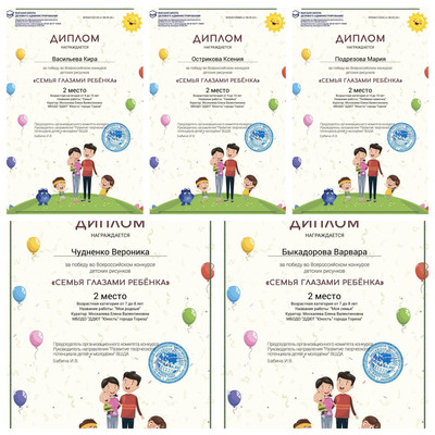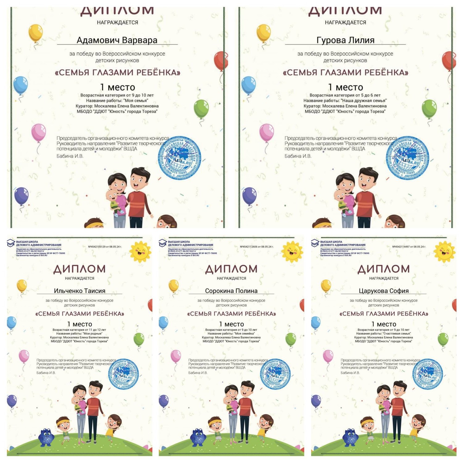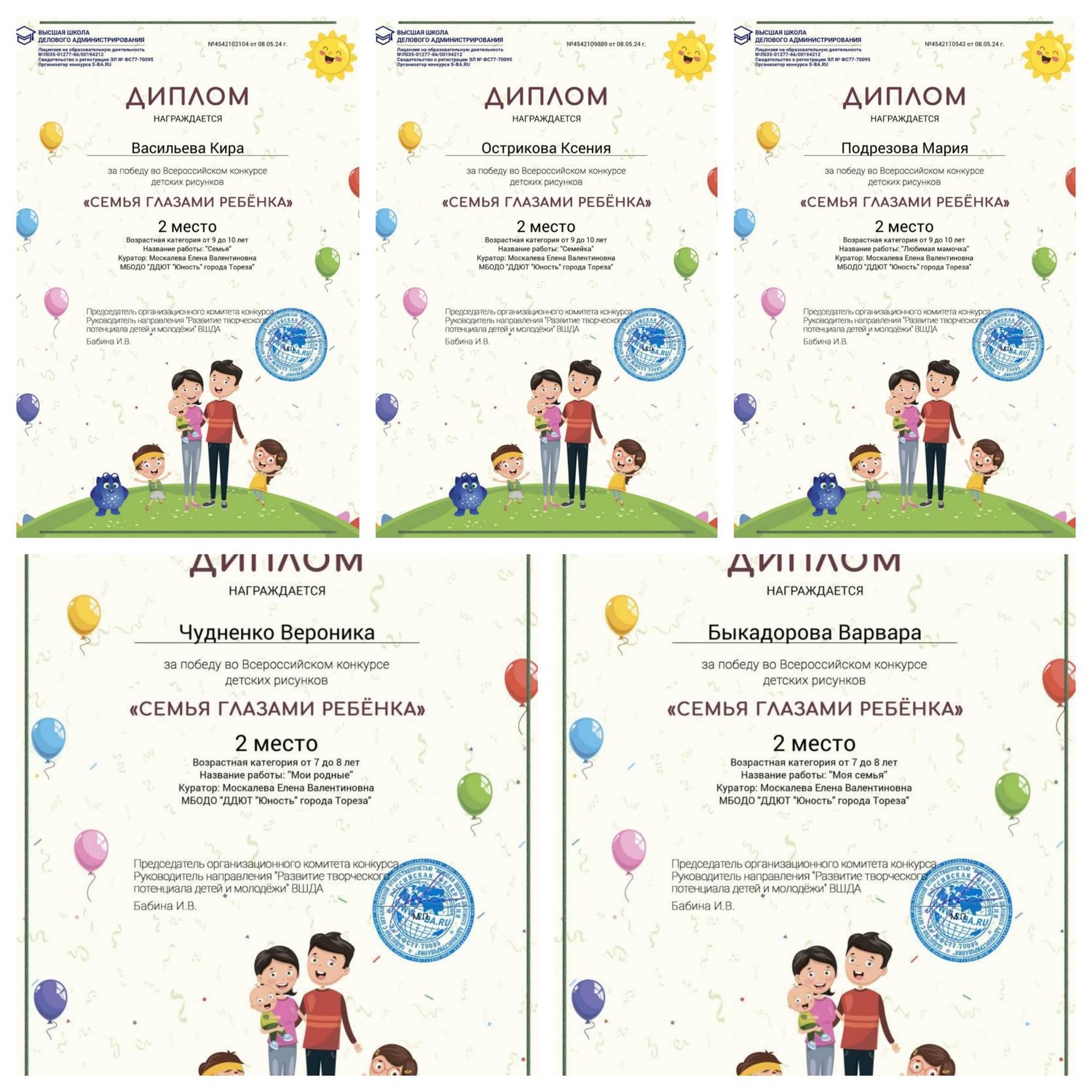 С 02 по 07 мая обучающиеся образцового художественного коллектива «Школа красоты» (педагог Москалева Е.В.) приняли участие во Всероссийском конкурсе детских рисунков «Семья глазами ребёнка» (ВШДА, г. Екатеринбург). 2024 год – Год семьи, поэтому стоить почаще вспоминать о своих самых близких людях. Предлагаем такую возможность! Итоги конкурса – 5 первых и 5 вторых мест! 1 место – Адамович Варвара, Гурова Лилия, Ильченко Таисия, Сорокина Полина, Царукова София. 2-е место – Быкадорова Варвара, Васильева Кира, Острикова Ксения, Подрезова Мария, Чудненко Вероника. Педагог награждена благодарственным письмом. Мы вами гордимся!
