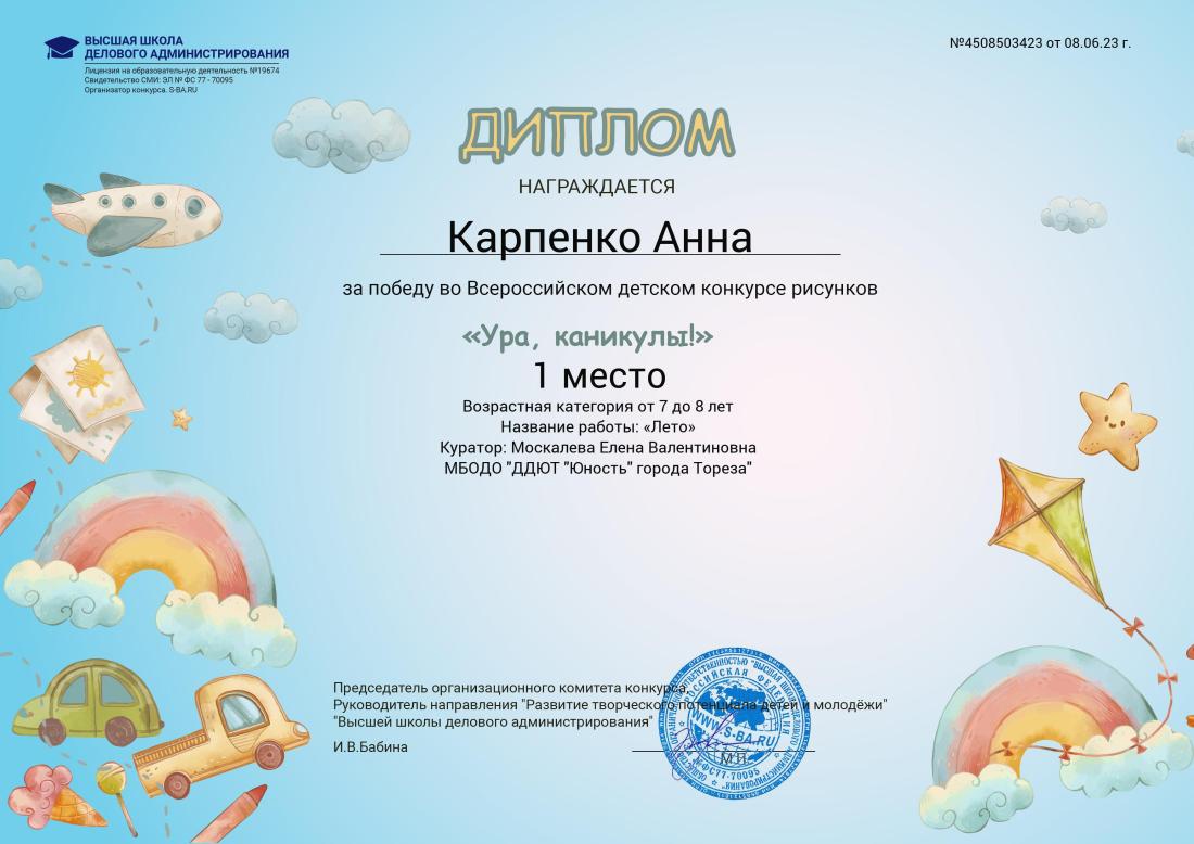 Со 2 по 7 июня обучающаяся образцового художественного коллектива «Школа красоты» (педагог Москалева Е.В.) Карпенко Анна приняла участие во Всероссийском конкурсе детских рисунков «Ура, каникулы!» (г. Екатеринбург). Организатор конкурса: Высшая школа делового администрирования. Каникулы, каникулы… Весёлая игра. Каникулы, каникулы… Всем отдохнуть пора. Лето, самое замечательное время года. Это время летних каникул! Дети ждут от каникул новых впечатлений, открытий, приключений и новых знакомств. Поездки в лагерь, на речку, на море, отдых в деревне у бабушки с дедушкой и просто наслаждение свободным временем, отсутствием уроков и домашних заданий. Выразите на рисунке то, как вы проводите свои летние каникулы. Результаты конкурса – первое место! Педагог награждена благодарственным письмом. Поздравляем и желаем творческих успехов! | |
