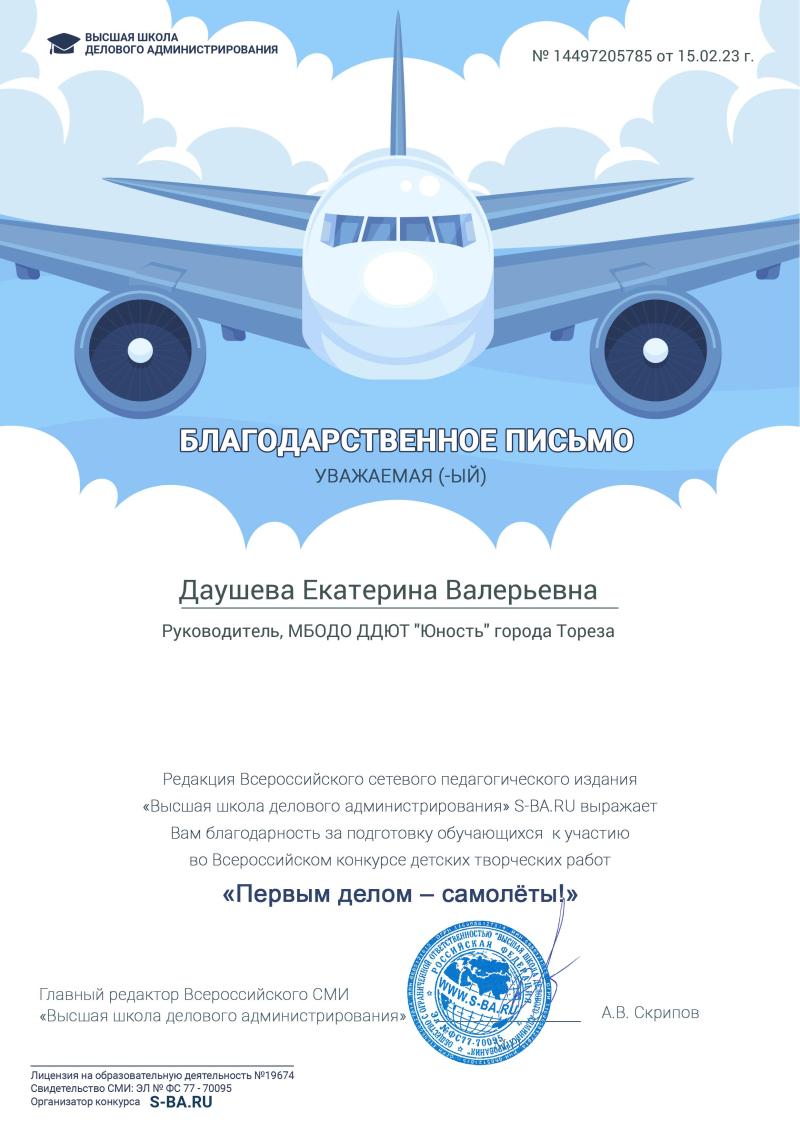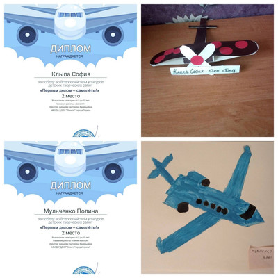 9 февраля День гражданской авиации в России. Сейчас в наш современный век самолёты являются одним из самых популярных, безопасных и быстрых видов транспорта, позволяющего наиболее удобно перевозить различные грузы, а также помогающие людям из одной точки страны или мира попасть в другую. Мы уже не можем представить свою обычную жизнь без гражданской авиации. А ведь самолёты, как это ни удивительно, появились всего лишь столетие назад! Обучающиеся народного художественного коллектива «Живопись и графика» (педагог Даушева Е.В.) с 9 по 14 февраля приняли участие во Всероссийском конкурсе детских творческих работ «Первым делом - самолеты!». Итоги конкурса – 2 вторых места. 2-е место – Клыпа София и Мульченко Полина. Педагог награждена благодарственным письмом. МОЛОДЦЫ!