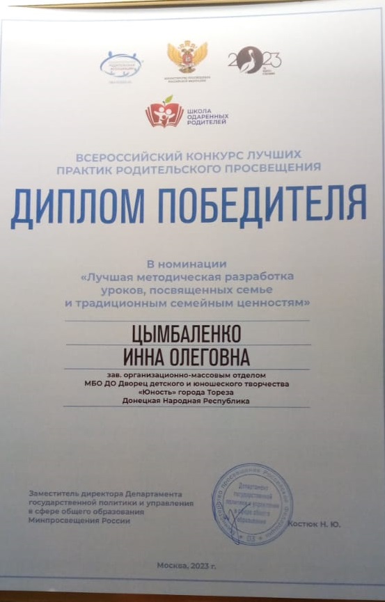 Педагог МБОДО «ДДЮТ «Юность» Цымбаленко И.О. стала победителем Всероссийского конкурса лучших практик родительского просвещения. На конкурс был представлен проект «Нескучный выходной». Этот конкурс в трёх традиционных номинациях – «Лучшая методическая разработка уроков, посвящённых семье и традиционным семейным ценностям», «Лучшая практика работы образовательных организаций по организации работы с родителями», «Лучший центр (программа) родительского просвещения» – проводится при поддержке Министерства просвещения Российской Федерации в целях повышения роли семьи и семейных ценностей у подрастающего поколения, выявления новых методик, совершенствования традиционных форм и распространения лучших педагогических практик, обеспечивающих воспитательный процесс в образовательных организациях, в том числе во взаимодействии семьи и школы. Более семисот заявок поступило от некоммерческих организаций, образовательных организаций, учреждений дополнительного образования, руководителей, заместителей руководителей, педагогов, учителей, работников дополнительного образования, воспитателей, педагогов-психологов, социальных педагогов из более, чем 70 субъектов РФ. | |