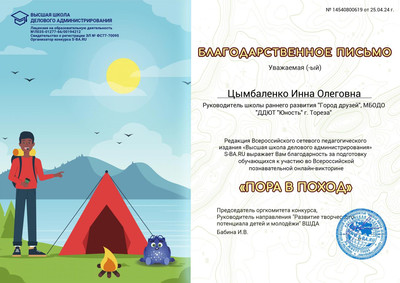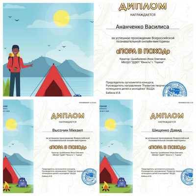 С 21 по 25 апреля обучающиеся школы раннего развития «Город друзей» Ананченко Василиса, Высочин Михаил и Шищенко Давид приняли участие во Всероссийской познавательной онлайн-викторине «Пора в поход», которая прошла на платформе ВШДА, г. Екатеринбург. Дети показали отличные знания, ответили на все вопросы. Педагог Цымбаленко И.О. награждена благодарственным письмом.
