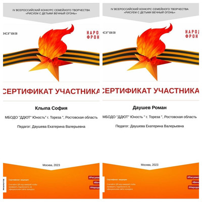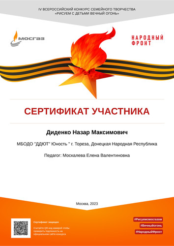 IV Всероссийский конкурс семейного творчества «Рисуем с детьми Вечный огонь» проводился с 20 апреля по 9 мая 2023 г. в рамках акции Народного фронта «Вечный огонь в нашем сердце». Для участия в конкурсе фотографии рисунков и поделок необходимо было разместить на странице в социальной сети «ВКонтакте» с официальными хештегами #Рисуемсмосгазом, #Вечныйогонь, #Народныйфронт. В конкурсе приняли участие обучаюшиеся МБОДО «ДДЮТ «Юность». С Донецкой Народной Республики было отправлено 2069 работ. Все участники получили сертификаты. Это: Клыпа София и Даушев Роман (народный художественный коллектив «Живопись и графика», педагог Даушева Е.В.), Овчинникова Анастасия (народный художественный коллектив «Рукодельница», педагог Дегтярева Е.Н.), Диденко Назар (образцовый художественный коллектив «Школа красоты», педагог Москалева Е.В.). Молодцы! Так держать! | |