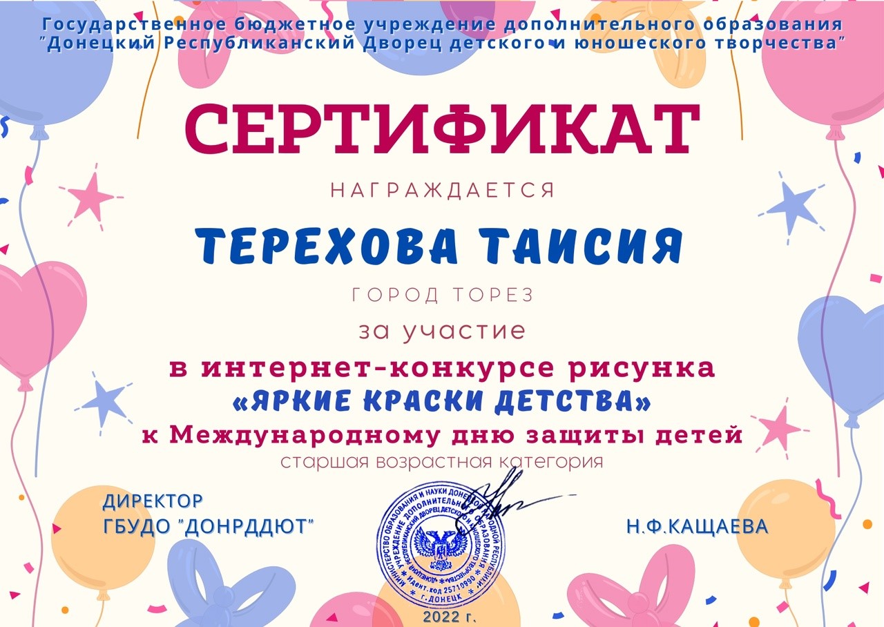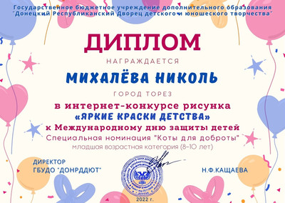 Обучающиеся МОДО «ДДЮТ «Юность» приняли участие в интернет-конкурсе «Яркие краски детства», организованном Донецким Республиканским ДДЮТ и посвящённом Международному Дню защиты детей. Конкурс проходил в дистанционном формате и его участниками стали более 200 детей из Донецкой Народной Республики и городов Архангельской области Российской Федерации. По итогам конкурса Михалёва Николь (образцовый художественный коллектив «Школа красоты, педагог Москалева Е.В.) награждена дипломом в специальная номинации – «Коты для доброты»; Терехова Таисия (народный художественный коллектив «Живопись и графика» награждена сертификатом участника.