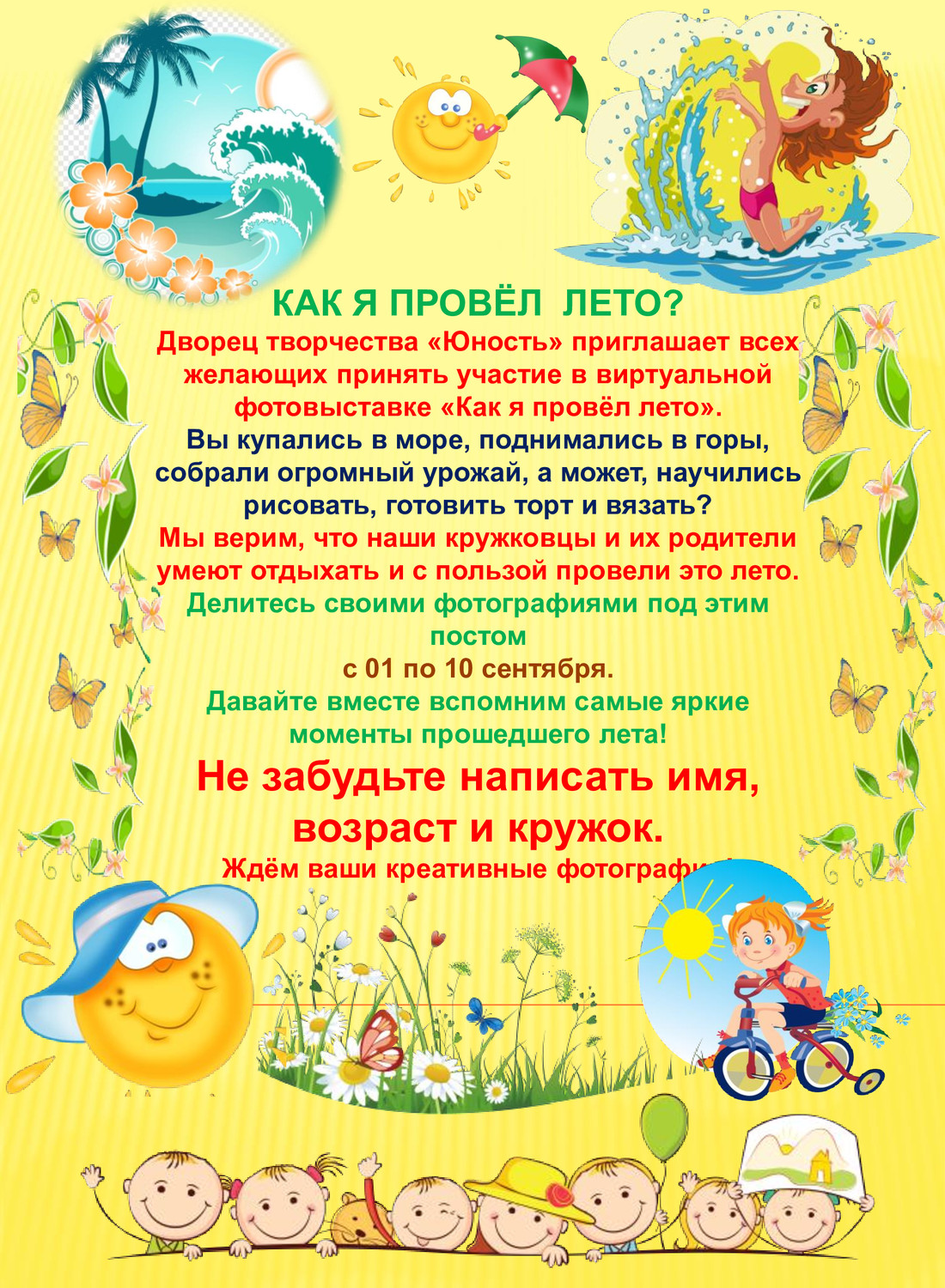 Как я провёл лето? Дворец творчества «Юность» приглашает всех желающих принять участие в виртуальной фотовыставке «Как я провёл лето». Вы купались в море, поднимались в горы, собрали огромный урожай, а может, научились рисовать, готовить торт и вязать? Мы верим, что наши кружковцы и их родители умеют отдыхать и с пользой провели это лето. Делитесь своими фотографиями под этим постом с 01 по 10 сентября. Давайте вместе вспомним самые яркие моменты прошедшего лета! Не забудьте написать имя, возраст и кружок. Ждём ваши креативные фотографии! | |
