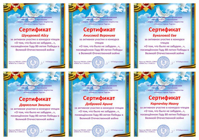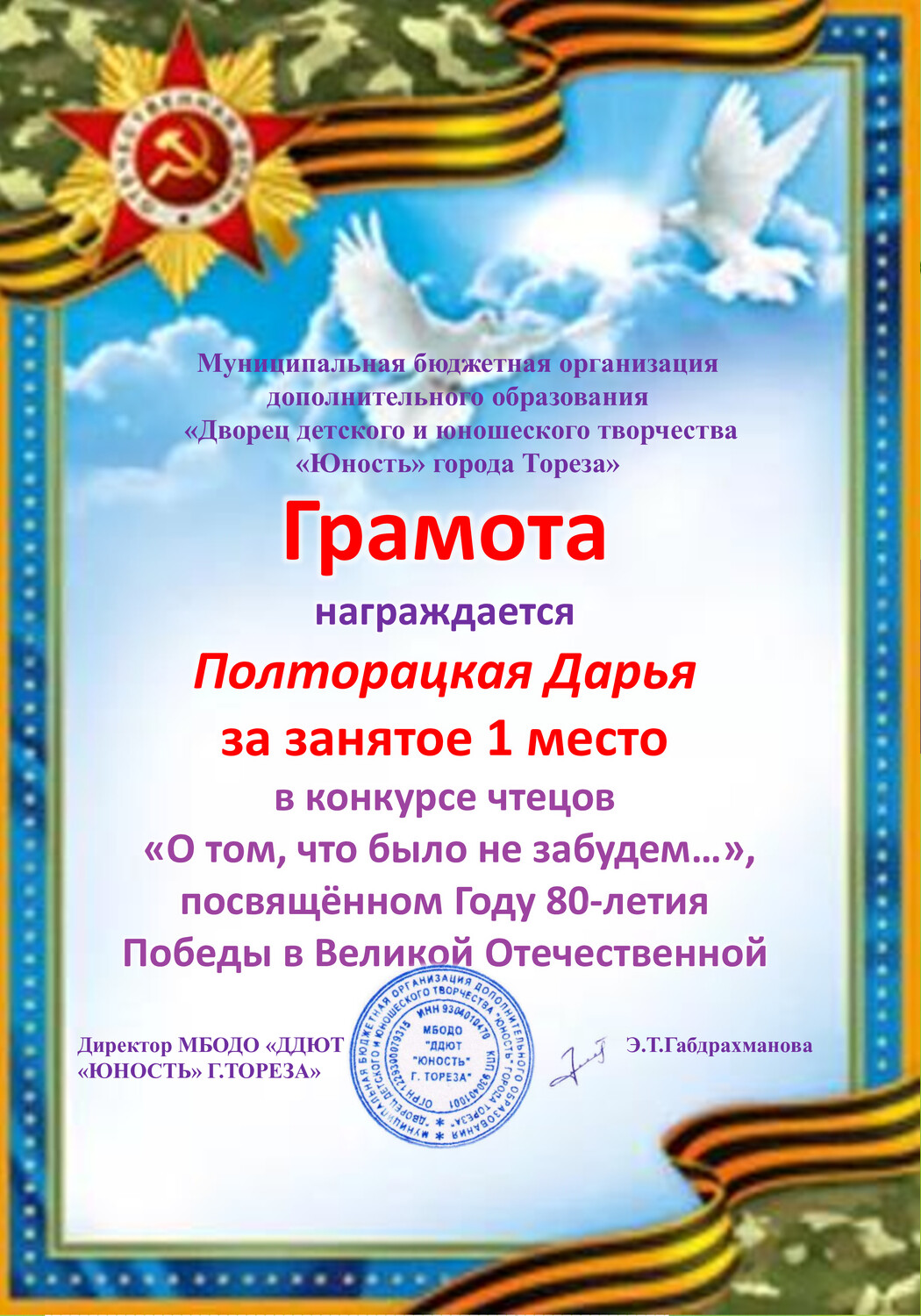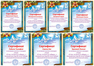 В рамках реализации проекта «Сквозь года звенит Победа», приуроченный Году 80-летию Победы в Великой Отечественной войне, году мира и единства в борьбе с нацизмом во Дворце творчества был проведён дистанционный конкурс чтецов «О том, что было, не забудем…». Итоги голосования: 1 место – Полторацкая Дарья (31 голос) 2 место – Тимченко Екатерина (22 голоса) 3 место – Тимченко Маргарита (12 голосов) Сертификаты участников – Букалова Ева, Трунова Полина, Шукурова Нурай, Шукурова Айсу, Сорока Ева, Карпачёв Иван, Радына Тимофей, Анисова Вероника, Доброва Арина, Дараселия Эмилия, Оболенцев Роман, Моторина Елизавета, Коршикова Карина. Поздравляем всех участников! Вы – большие молодцы! | |