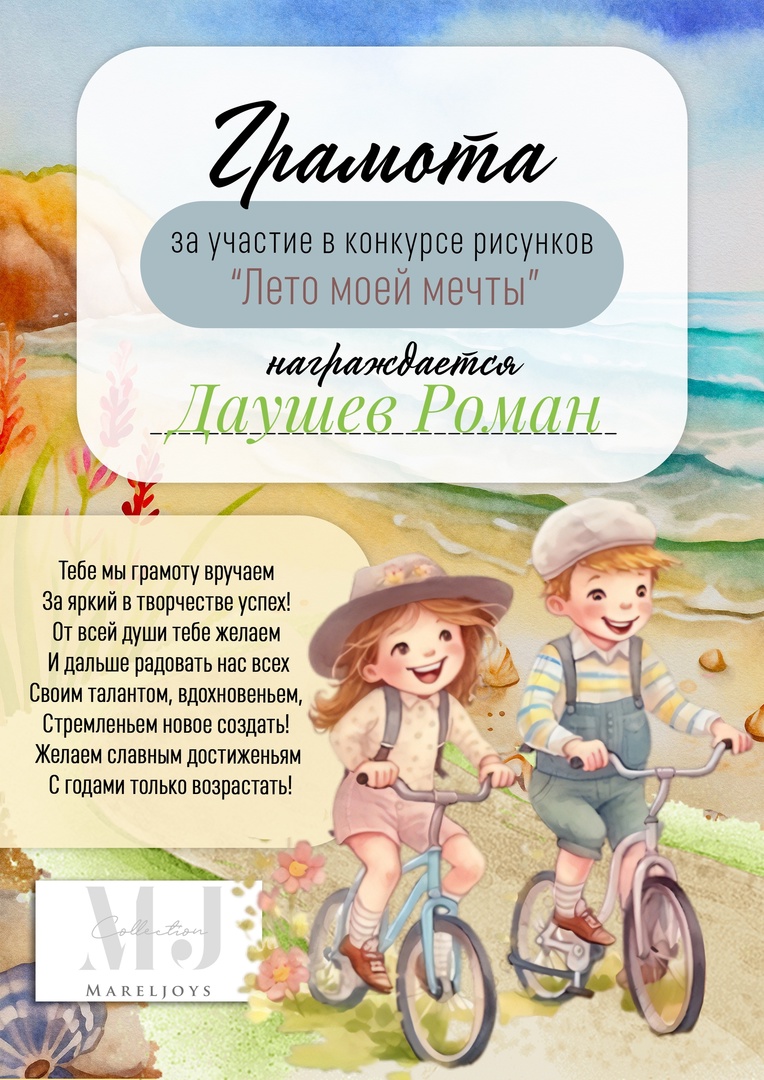 Поздравляем Даушева Романа, обучающегося народного художественного коллектива «Живопись и графика» (педагог Даушева Е.В.), с участием в детском конкурсе рисунков «Лето Моей Мечты». Организатор конкурса - онлайн магазин «Mareljoys». Конкурсы рисунков - это прекрасный способ познакомить ребёнка с миром творчества и безграничной фантазии. Поздравляем! | |