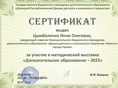 Педагоги МБОДО «ДДЮТ «Юность» Гавриленко А.С., Рымар В.С. и Цымбаленко И.О. награждены сертификатами ГБУ ДО «ДонРДДЮТ» за участие в методической выставке-2023. Поздравляем!