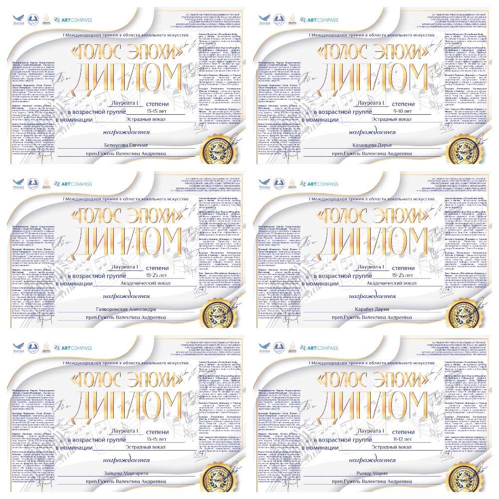 I Международная премия в области вокального искусства "ГОЛОС ЭПОХИ" (г. Санкт-Петербург) организована Творческим объединением "ТРИУМФ" - CA Triumph - членом CID UNESCO. В конкурсе приняли участие солисты народного ансамбля эстрадной песни «Тоника» (педагог Гужель В.А.). По итогам конкурса все участники стали лауреатами 1-ой степени! Это – Гайворонская Александра, Карабет Дария, Рымар Мария, Зайцева Маргарита, Селионова Алина, Белоусова Евгения и Казанцева Дарья.