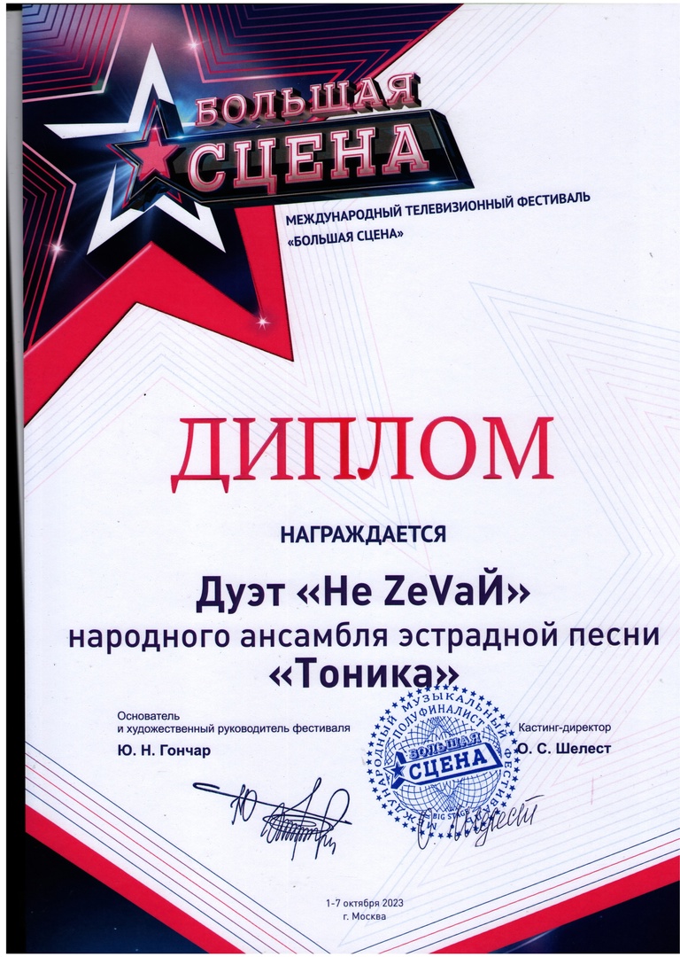 С 1 по 7 октября солисты народного ансамбля эстрадной песни «Тоника» (педагог Гужель В.А.) МБОДО «ДДЮТ «Юность» Зайцева Маргарита и Матвиенко Ева приняли участие в полуфинале и финале фестиваля на концертной площадке Vegas Сity Hall в Москве при поддержке Президентского фонда культурных инициатив. «Большая сцена» — это фестиваль для талантливых детей, подростков и молодежи от 6 до 25 лет. Проект даёт возможность молодым талантам не только занять призовые места, но и приобрести новый опыт, знания, новые профессиональные навыки, повысить квалификацию, а также завести новых друзей-единомышленников из разных стран мира. Цель фестиваля — выявление и поддержка новых звёзд среди детей и молодежи. Наши талантливые девчонки стали дипломантами фестиваля! Во время фестиваля, помимо самих конкурсных дней, проходила ежедневная образовательная программа от ведущих спикеров: по вокалу, хореографии, ораторскому и сценическому мастерству, сонграйтингу и музыкальному продюсированию. Всех участников ждали яркие флешмобы, встречи с известными педагогами и любимыми артистами, подарки и памятные сувениры. Во многом благодаря творческим конкурсам наши дети приобретают бесценный опыт исполнительского мастерства, встречают новых друзей и постигают безграничную радость творчества. Участие в фестивале «Большая сцена» даст импульс к дальнейшему профессиональному росту и покорению новых вершин. Фестиваль «Большая сцена» — это не только серьезное испытание, но прежде всего яркий, замечательный праздник.