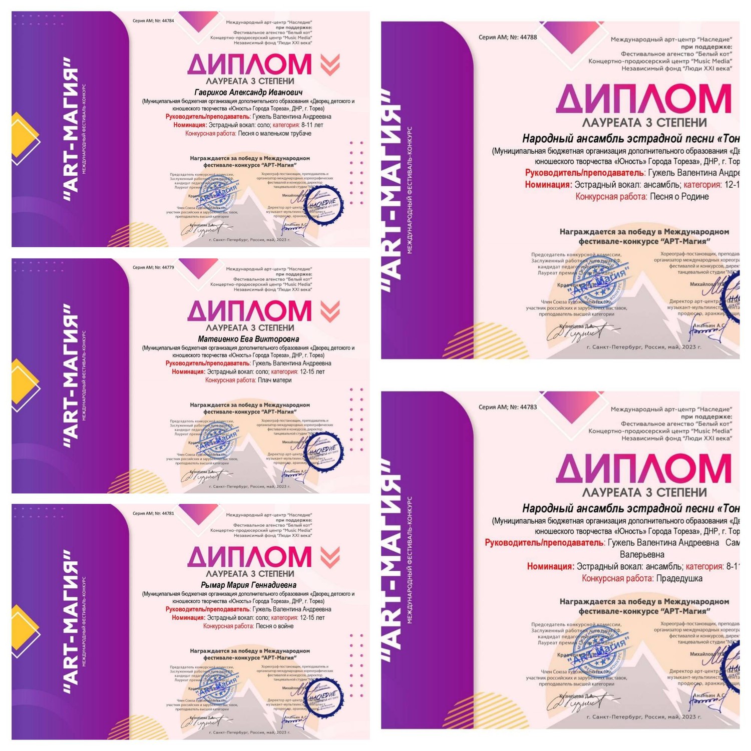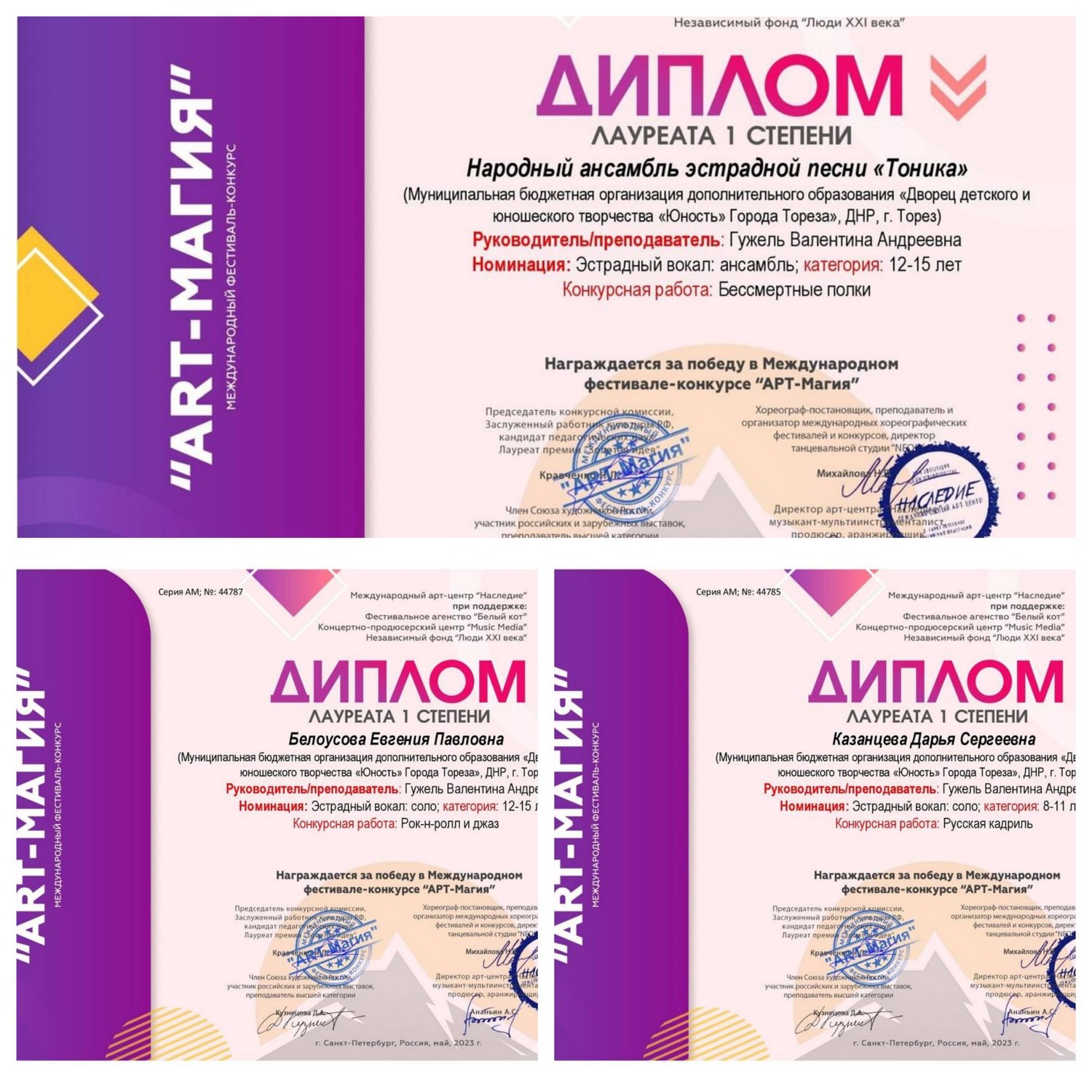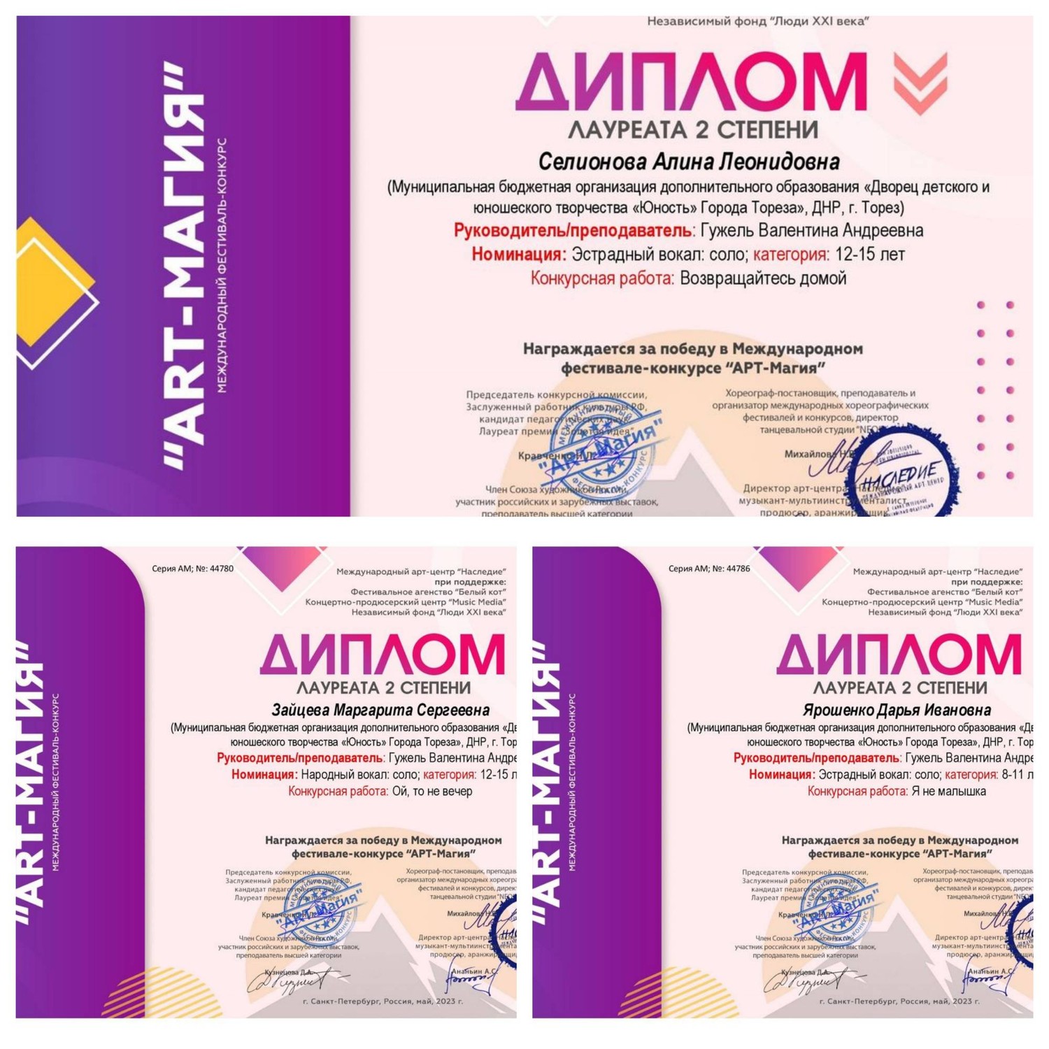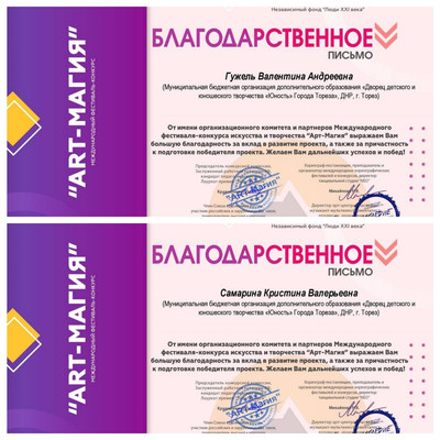 Народный ансамбль эстрадной песни «Тоника» (педагог Гужель В.А.) МБОДО «ДДЮТ «Юность» принял участие в заочном Международном фестивале искусства и творчества «Арт-магия» (г. Санкт-Петербург). Учредитель и основной организатор проекта – Фестивальное агентство «Белый кот». Партнеры проекта – творческое объединение «Премьера», концертно-продюсерский центр «Мьюзик Медиа» Поддержка и спонсоры: АНО «Центр поддержки и развития культуры «Наследие» Независимый фонд «Люди XXI века» Золотодобывающая компания «Амальгам» Группа компаний «Центр по продвижению бизнес-инициатив». Организаторы фестиваля преследовали следующие задачи: • Поддержка самодеятельного и профессионального творчества; • Поощрение выдающихся деятелей самодеятельного и профессионального творчества; • Популяризация и развитие самодеятельного профессионального творчества; • Привлечение подрастающего поколения к самодеятельному и профессиональному творчеству; • Поиск и поддержка новых талантов. Результаты конкурса – 3 первых места, 3 вторых и 5 третьих! 1-е места – Белоусова Евгения, Казанцева Дарья и старшая группа ансамбля («Бессмертные полки»); 2-е места – Зайцева Маргарита, Селионова Алина и Ярошенко Дарья; 3-и места – Матвиенко Ева, Рымар Мария, Гавриков Александр, младшая группа ансамбля («Прадедушка») и старшая группа ансамбля («Песня о Родине»). Педагоги ансамбля награждены благодарственными письмами. Поздравляем с отличными результатами! | |
