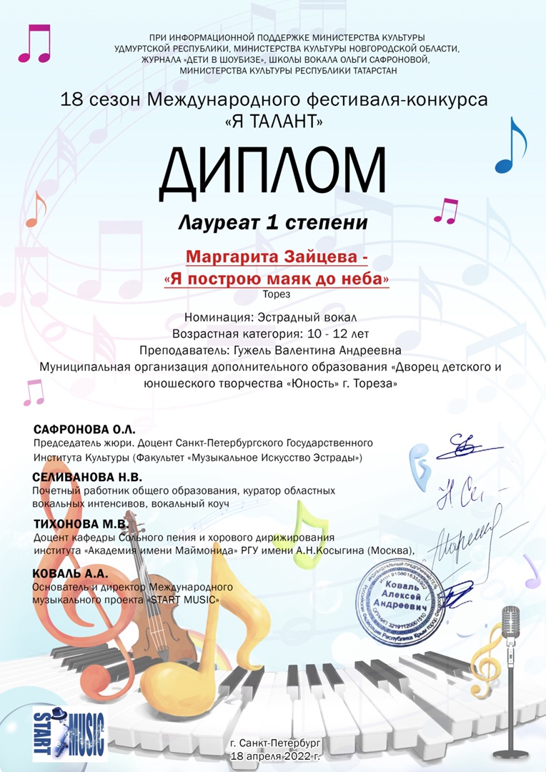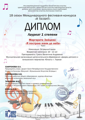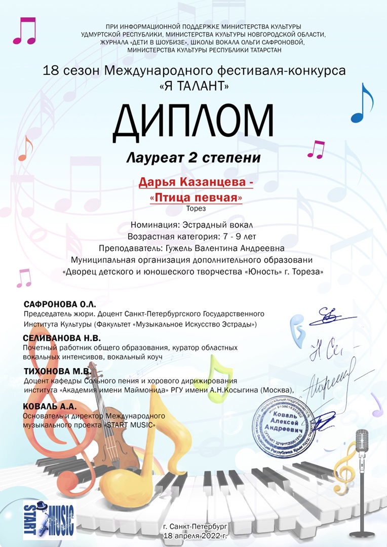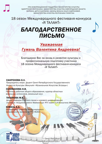 Обучающиеся народного ансамбля эстрадной песни «Тоника» (педагог Гужель В.А.) МОДО «ДДЮТ «Юность» приняли участие в 18 сезоне Международного фестиваля-конкурса «Я ТАЛАНТ». Основная цель международного конкурса – поддержка и определение талантливых детей, молодёжи и профессиональных коллективов, определение их мастерства и профессионализма. Конкурс проводился в заочной форме - по видеозаписям в группе проекта: https://vk.com/projectstartmusic Конкурс проходил при информационной поддержке Министерства культуры Республики Татарстан, Удмуртской Республики, Новгородской области и Школы вокала Ольги Сафроновой «Safronova School». Информационный партнер конкурса - Журнал "Дети в Шоубизе". Итоги конкурса: Лауреат 1-ой степени – Зайцева Маргарита, Лауреат 2-ой степени – Казанцева Дарья. Валентина Андреевна награждена благодарственным письмом за подготовку участников конкурса. Поздравляем с достойной победой в конкурсе! Миг успеха – короткая передышка перед новым стартом. Пусть энергия этих мгновений успеха зарядят вас позитивом и даст толчок к новым свершениям. Не останавливайтесь на достигнутом, совершенствуйтесь и всегда верьте в свои силы! | |