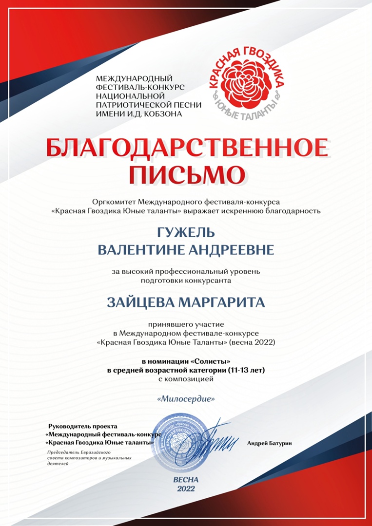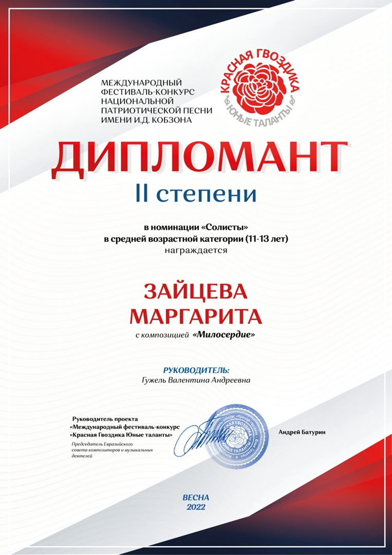Зайцева Маргарита, солистка народного ансамбля эстрадной песни «Тоника» (педагог Гужель В.А.) МОДО ДДЮТ «Юность», приняла участие в Международном фестивале-конкурсе национальной патриотической песни «Красная гвоздика Юные Таланты» (весна 2022)» имени И.Д. Кобзона (г. Москва). Учредители конкурса - Благотворительный фонд содействия культуре и спорту «ЮнОлимп», Евразийский Совет композиторов и музыкальных деятелей и Автономная некоммерческая организация «Бюро пропаганды, поддержки и развития музыкальной культуры». Конкурс проходил при поддержке Союза композиторов Евразии. Цели Конкурса: