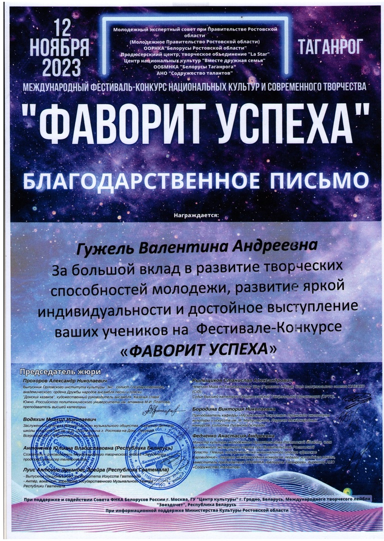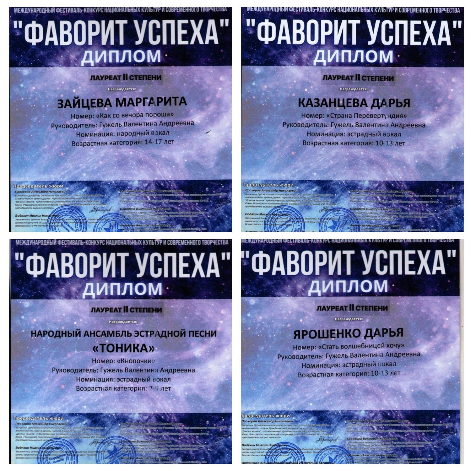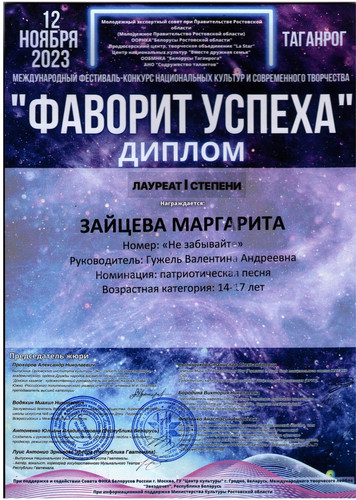 12 ноября народный ансамбль эстрадной песни «Тоника» (педагог Гужель В.А.) МБОДО «ДДЮТ «Юность» принял участие в Международном фестивале-конкурсе национальных культур и современного творчества «Фаворит успеха» (г. Таганрог). Учредители и организаторы фестиваля-конкурса -Автономная некоммерческая организация «Содружество талантов» -Общественная организация белорусская местная национально-культурная автономия «Белорусы Таганрога» При поддержке и содействии -Молодежный экспертный совет при Правительстве Ростовской области (Молодежное Правительство Ростовской области) -Центр Национальных Культур «Вместе дружная семья» - Продюсерский центр, творческое объединение «La Star», город Таганрог, Ростовская область. - Совет ФНКА Белорусов России, г. Москва - Международный творческий лейбл «Звездочёт», Республика Беларусь При информационной поддержке - МИНИСТЕРСТВО КУЛЬТУРЫ РОСТОВСКОЙ ОБЛАСТИ Цели и задачи - Гармонизация межэтнических отношений в молодежной среде, формирование гражданско-патриотических чувств у подрастающего поколения; - Воспитание патриотизма и преданности своему Отечеству; - Сохранение, развитие и популяризация национального традиционного культурного наследия народов и народностей РФ, стран ближнего и дальнего зарубежья; - Объединение разных народов и социальных групп, сохранение их культурной самобытности; - Актуализация интереса молодёжи к истокам родной национальной культуры, формирование национального самосознания, укрепление межэтнических отношений; - Воспитание бережного отношения и уважения к национальной культуре, национальным традициям, создание условий для культурного обмена и национального взаимодействия; - Приобщение молодёжи к лучшим образцам мирового музыкального наследия, национального фольклора; - Выявление лучших творческих коллективов, занимающихся изучением, сохранением и популяризацией народной культуры, поддержка наиболее талантливых и перспективных детей и молодежи;; - Сохранение и развитие народных промыслов и фольклора как элемент духовно-нравственного воспитания; - Повышение уровня исполнительского мастерства участников, поддержка талантливой молодёжи в реализации их творческого потенциала; - Знакомство с обычаями, ритуалами народов России, ближнего и дальнего зарубежья, расширение межнационального культурного сотрудничества; - обмен творческим опытом и укрепление дружеских отношений между участниками из разных регионов России ближнего и дальнего зарубежья; - Организация активного досуга подрастающего поколения. Конкурс был не из лёгких, жюри очень строгое, но наши певучие птички показали себя очень достойно – 1 первое и 5 вторых мест! 1-е место – Зайцева Маргарита (патриотическая песня). 2-е места – Ярошенко Дарья, Казанцева Дарья, Селионова Алина, Зайцева Маргарита (народный вокал), ансамбль (7-9 лет). Руководитель награждена благодарственным письмом. Поздравляем участников и руководителя! Продолжайте радовать нас вашими победами! | |