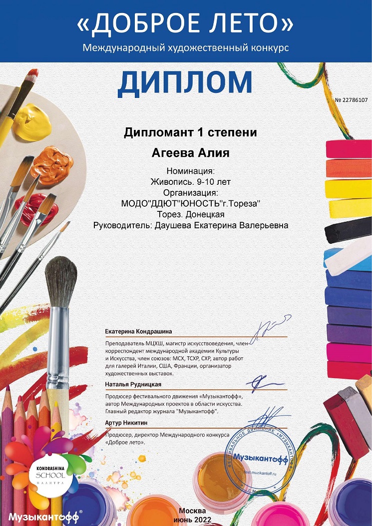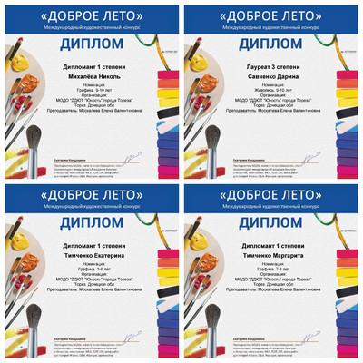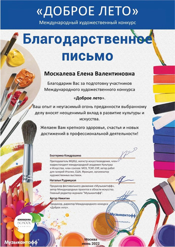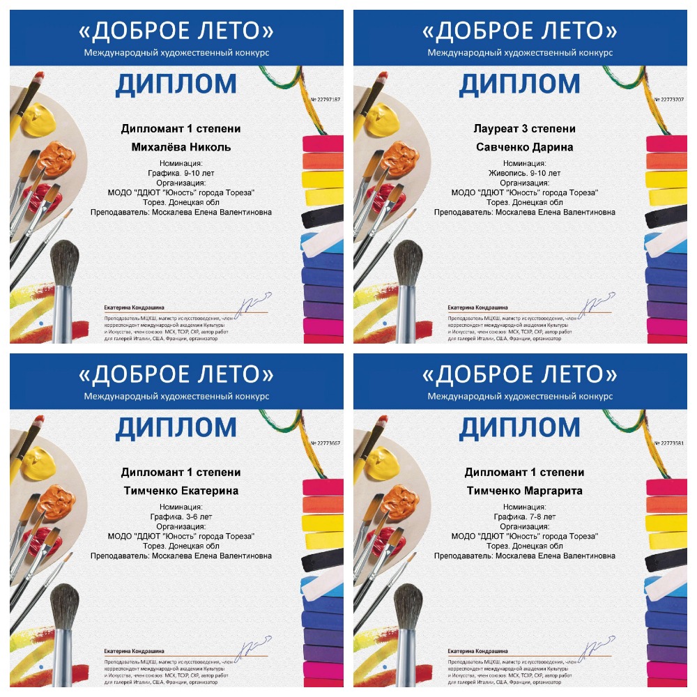 С 01 по 10 июня обучающиеся ТО приняли участие в Международном художественном конкурсе «Доброе лето» от фестивального движения «Музыкантофф» (г. Москва). Итоги конкурса – 3 лауреата 3-ей степени и 4 дипломанта 1-ой степени! Народный художественный коллектив «Живопись и графика» (педагог Даушева Е.В.): Лауреат 3-ей степени – Баларченко виктория, Дипломант 1-ой степени – Агеева Алия. Образцовый художественный коллектив «Школа красоты» (педагог Москалева Е.В.): 2 Лауреата 3-ей степени – Савченко Дарина и Кривенко Мария, 3 дипломанта 1-ой степени – Тимченко Екатерина, Тимченко Маргарита и Михалёва Николь. Руководители награждены благодарственными письмами за подготовку участников Международного конкурса. Поздравляем участников и педагогов! | |