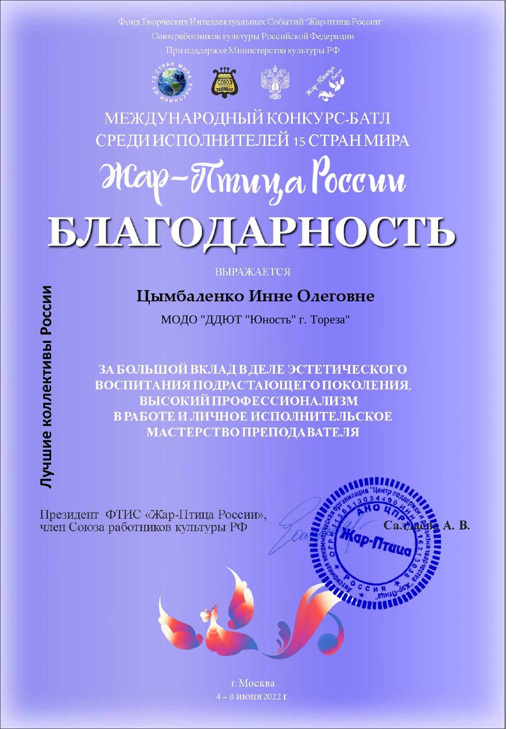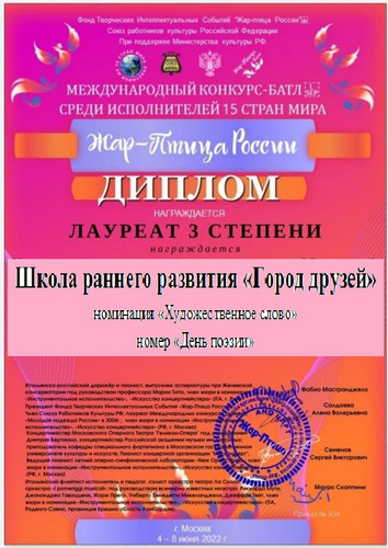 В июне состоялся дистанционный Международный конкурс-баттл среди исполнителей 15 стран мира «Жар-птица России» (г. Москва), в котором приняла участие с номером «День поэзии» школа раннего развития «Город друзей» (педагог Цымбаленко И.О.). Организаторы – фонд творческих интеллектуальных событий «Жар-птица России», союз работников культуры РФ при поддержке Министерства культуры РФ. По итогам конкурса школа раннего развития стала лауреатом 3-ей степени! | |