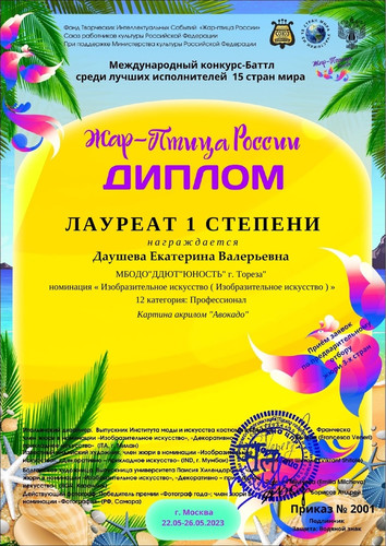 Педагог МБОДО «ДДЮТ «Юность» Даушева Екатерина Валерьевна с 22.05 по 26.05 2023 приняла участие в Международном конкурсе-баттле среди преподавателей 15 стран «Жар-птица России» (г. Москва) и стала лауреатом 1-ой степени! Поздравляем! | |