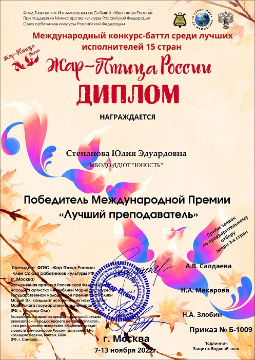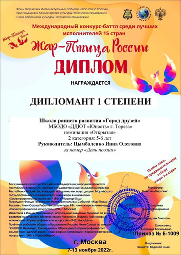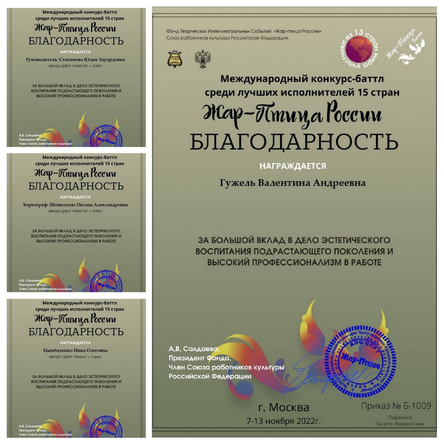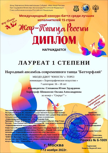 С 07 по 13 ноября творческие коллективы МБОДО «ДДЮТ «Юность» приняли участие в Международном конкуре-баттле «Жар-Птица России» из 15 стран Мира (г. Москва). В конкурсе участвовали только лауреаты 1 мест и Гран-При. Итоги конкурса: Народный ансамбль эстрадной песни «Тоника» (педагог Гужель В.А.): Лауреаты 1-ой степени – Зайцева Маргарита и Рымар Мария, Лауреат 2-ой степени –Крюк Татьяна, Лауреат 3-ей степени - Селионова Алина. Народный ансамбль современного танца «Баттерфляй» (педагог Степанова Ю.Э.): Лауреат 1-ой степени – номер «Скерцо». Степанова Юлия Эдуардовна награждена дипломом "Лучший преподаватель". Школа раннего развития «Город друзей» (педагог Цымбаленко И.О.): Дипломант 1-ой степени, номер «День поэзии». Педагоги награждены благодарственными письмами. Поздравляем! | |