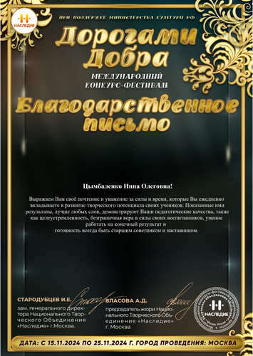 С 15.11. по 25.11.2024 воспитанница школы раннего развития «Супер детки» Иващенко Ульяна приняла участие в Международном конкурсе-фестивале «Дорогами добра», г.Москва (номинация «Художественное слово») и стала лауреатом 2-ой степени! Педагог Цымбаленко И.О. награждена благодарственным письмом. Поздравляем! | |
