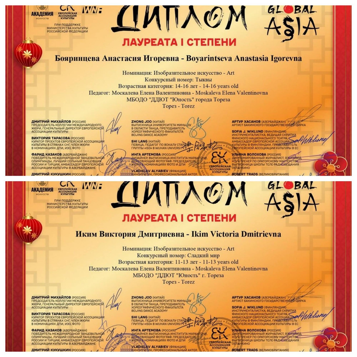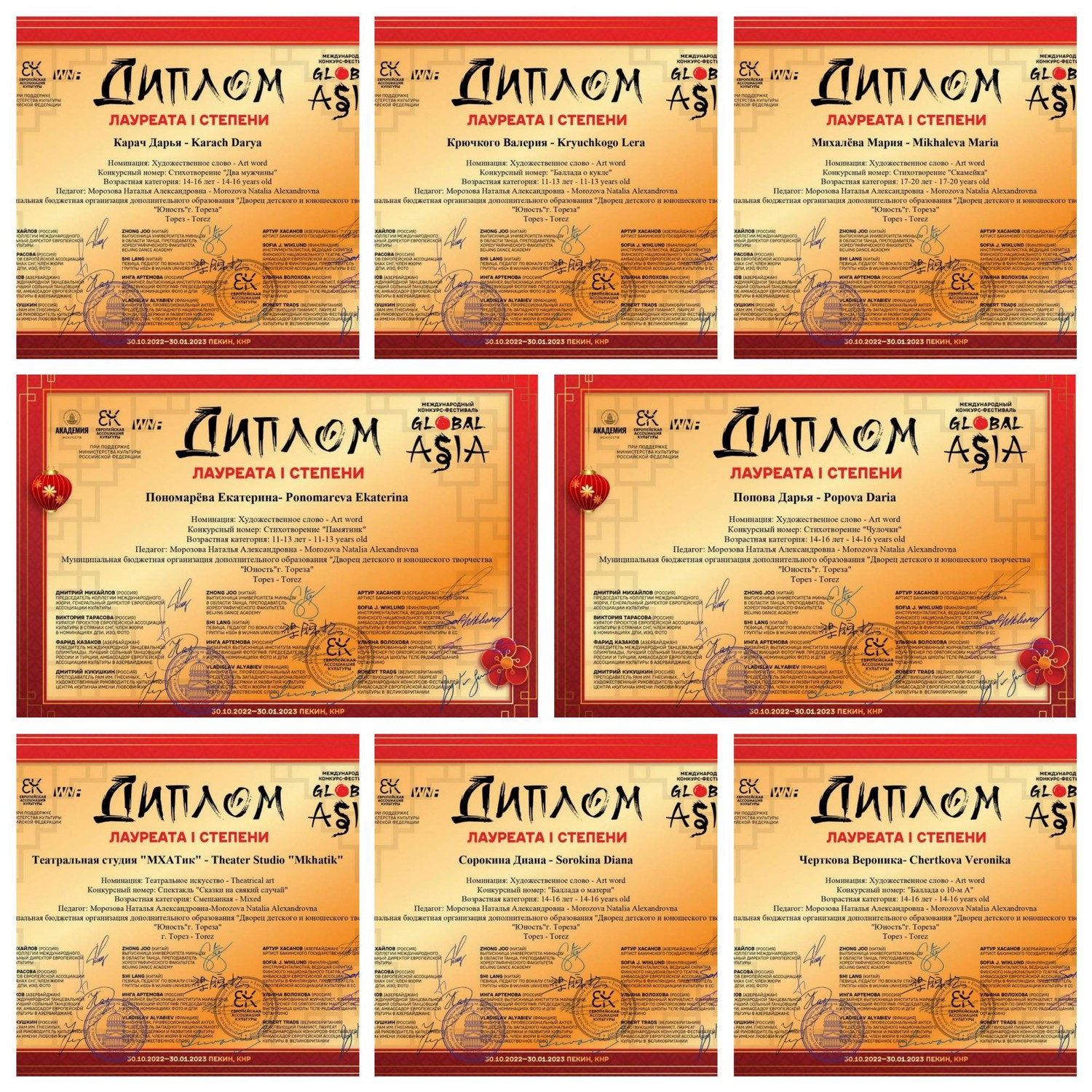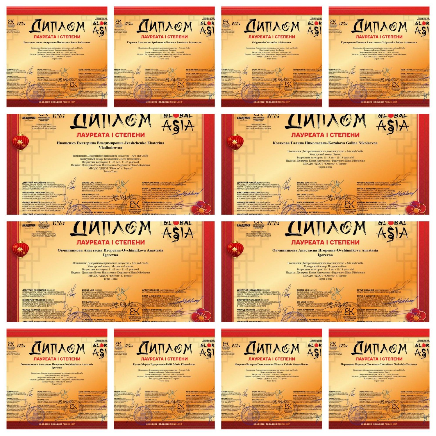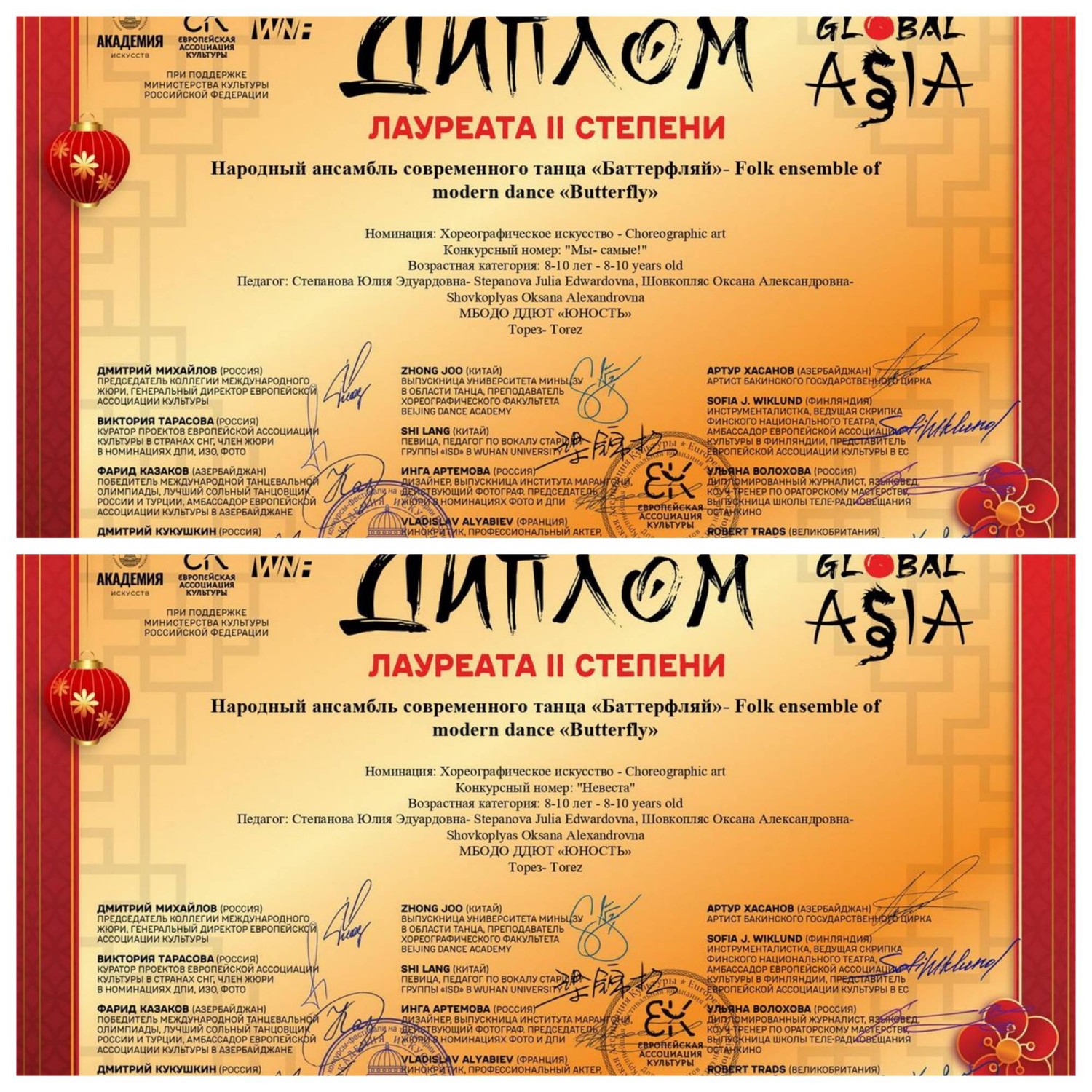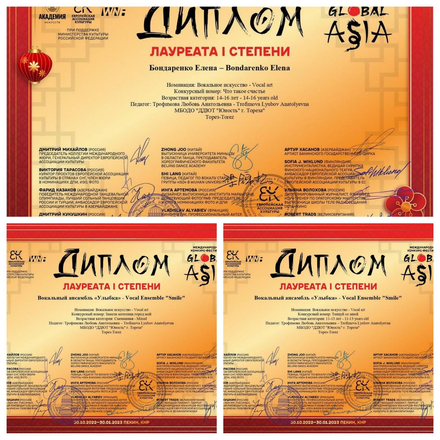 С 30.10 по 16.11 обучающиеся и педагоги МБОДО «ДДЮТ «Юность» приняли участие в дистанционном Международном зарубежном конкурсе-фестивале "Global Asia" 2022 (Китай). Организатор: Европейская Ассоциация Культуры. 1. Информационная поддержка Министерства Культуры; 2. Академия Искусств (Санкт-Петербург); 3. Западный Национальный Фонд поддержки и развития культуры и искусства (Париж, Франция); 4. Информационная поддержка государственного портала "ProCultura"; 5. Международный детский музыкальный конкурс народных исполнителей "МИР" (Музыка и Развитие); 6. Оркестр Яковлева "Grand Melody Orchestra"; 7. АНО "Азбука музыки" Общие цели и задачи: Выявление и всесторонняя поддержка талантливых и перспективных людей; Создание условий для реализации творческого потенциала; Повышение профессиональных навыков руководителей коллективов и педагогов; Обмен профессиональным творческим опытом и укрепление дружественных отношений между участниками из разных регионов России и зарубежья; Способствование объединению детей разных национальностей на принципах мирного сосуществования, толерантности и творческого взаимопонимания. Привлечение внимания со стороны государственных, международных и коммерческих организаций к поддержке творческого воспитания среди всех слоев населения. В копилку Дворца внесено 69 первых мест (из них 14 первых мест у педагогов) и 28 вторых мест! Народный ансамбль современного танца «Баттерфляй» (педагог Степанова Ю.Э.): 9 лауреатов 1-ой степени – «Скерцо», «Пароход», «Рождественская мистерия», «Баварская вечеринка», «Я-огонь, ты-вода», «Шоумен», «Либеральное танго», «Хранители времени», 2 лауреата 2-ой степени – «Невеста», «Мы самые». Театральная студия «МХАТик» (педагог Морозова Н.А.): 15 лауреатов 1-ойстепени – Бородацкая София, Григорусь Вероника (2 диплома), Попова Дарья, Диденко Алиса (2 диплома), Карач Дарья, Крючкова Валерия, Черткова Вероника, Сорокина Диана, Михалёва Мария, Пономарёва Екатерина, спектакли – «Дети во время войны», «Сказки на всякий случай», «Ещё не взрослые, уже не дети», 8 лауреатов 2-ой степени – Бородацкая София, Пашкова Валерия, Стебакова Анастасия, Донцов Милан, Сорокина Полина, Лукьянчикова Мария, Гануляк Лев, Низамова Владислава. Народный ансамбль эстрадной песни «Тоника» (педагог Гужель В.А.): 6 лауреатов 1-ой степени – Рымар Мария, Зайцева Маргарита, Селионова Алина, Белоусова Евгения, Абдулаева Эмилия, квартет, Лауреат 2-ой степени – Казанцева Дарья. Народный художественный коллектив «Волшебная ниточка» (педагог Привалова Т.А.): 7 дипломов за работы педагогу Приваловой Т.А., 7 лауреатов 1-ой степени – Овчинникова Анастасия, Прошко Юлия, Мемус Кира, Фирсова Валерия, Долгих Анна, Федорченко Ксения, Крушельницкая Валерия, 3 лауреата 2-ой степени – Долгих Юлия, Тимченко Маргарита, Чернявская Полина. Образцовый художественный коллектив «Школа красоты» (педагог Москалёва Е.В.): Диплом победителя руководителю Москалевой Е.В., 2 лауреата 1-ой степени – Иким Виктория, Бояринцева Анастасия, 7 лауреатов 2-ой степени – Дьяченко София, Борцова Дарья, Гануляк Лев, Овчинникова Анастасия, Савченко Дарина, Тимченко Екатерина, Якимчук Арина. Школы раннего развития «Город друзей» и «Супер детки» (педагог Цымбаленко И.О.): Диплом за 1 место педагогу Цымбаленко И.О. за мастер-класс, 7 лауреатов 2-ой степени – «День поэзии», «Визитная карточка», Малина Екатери
