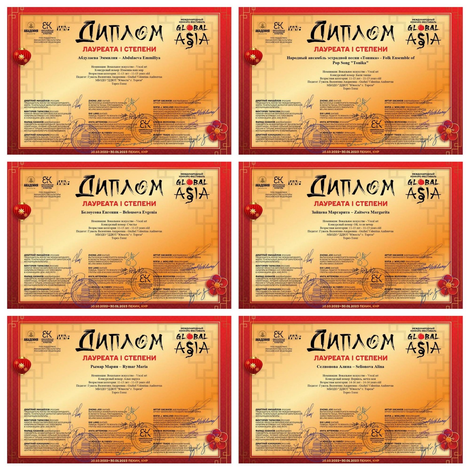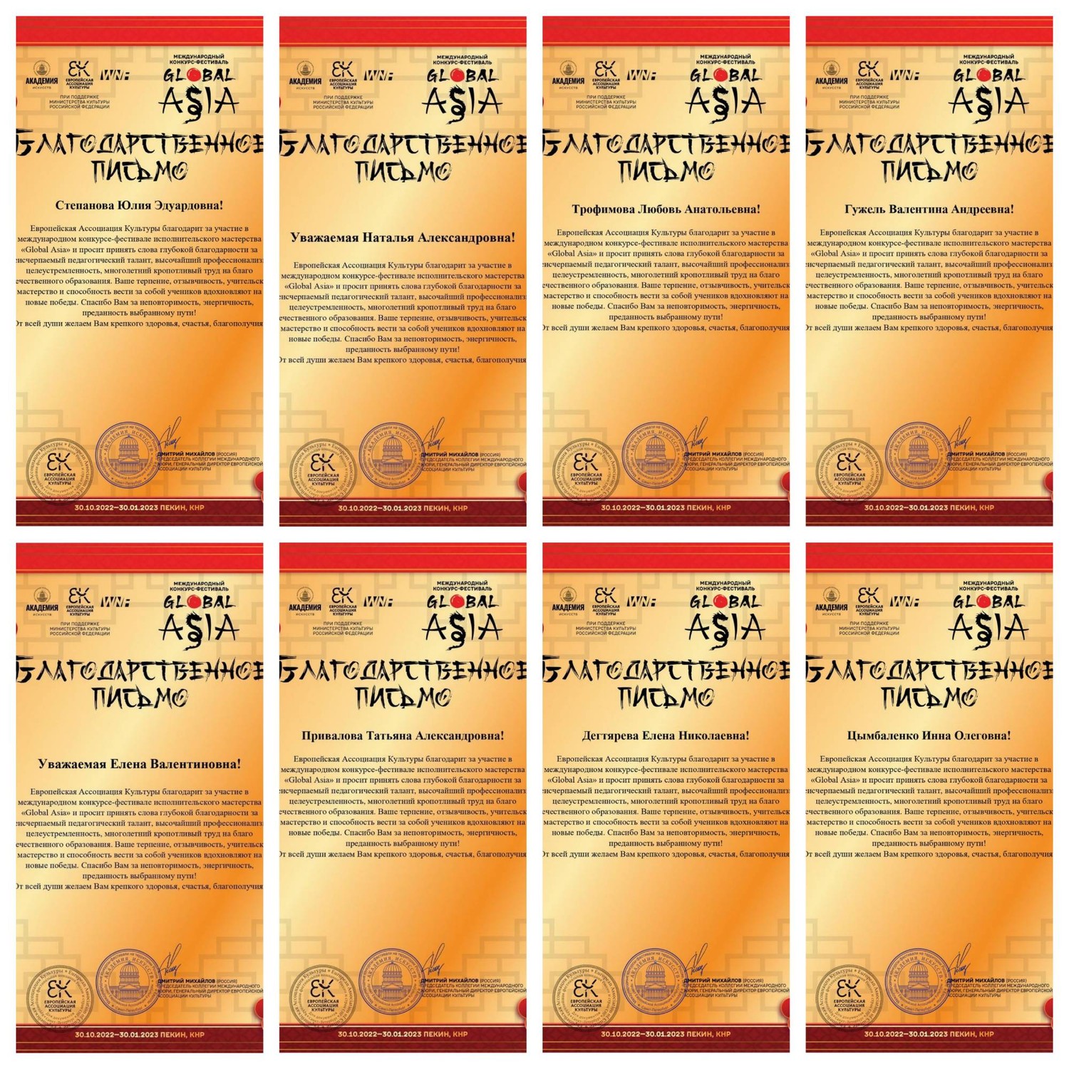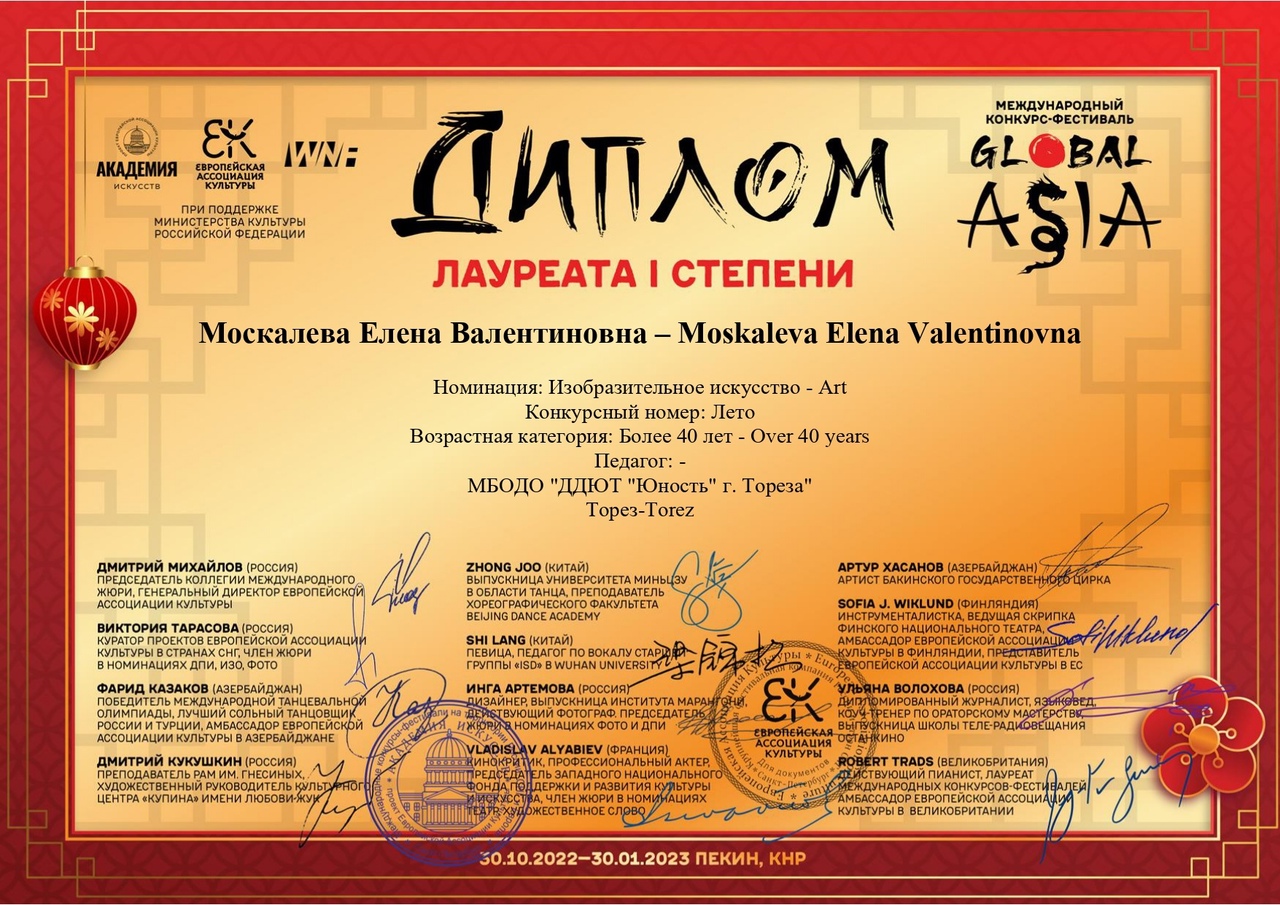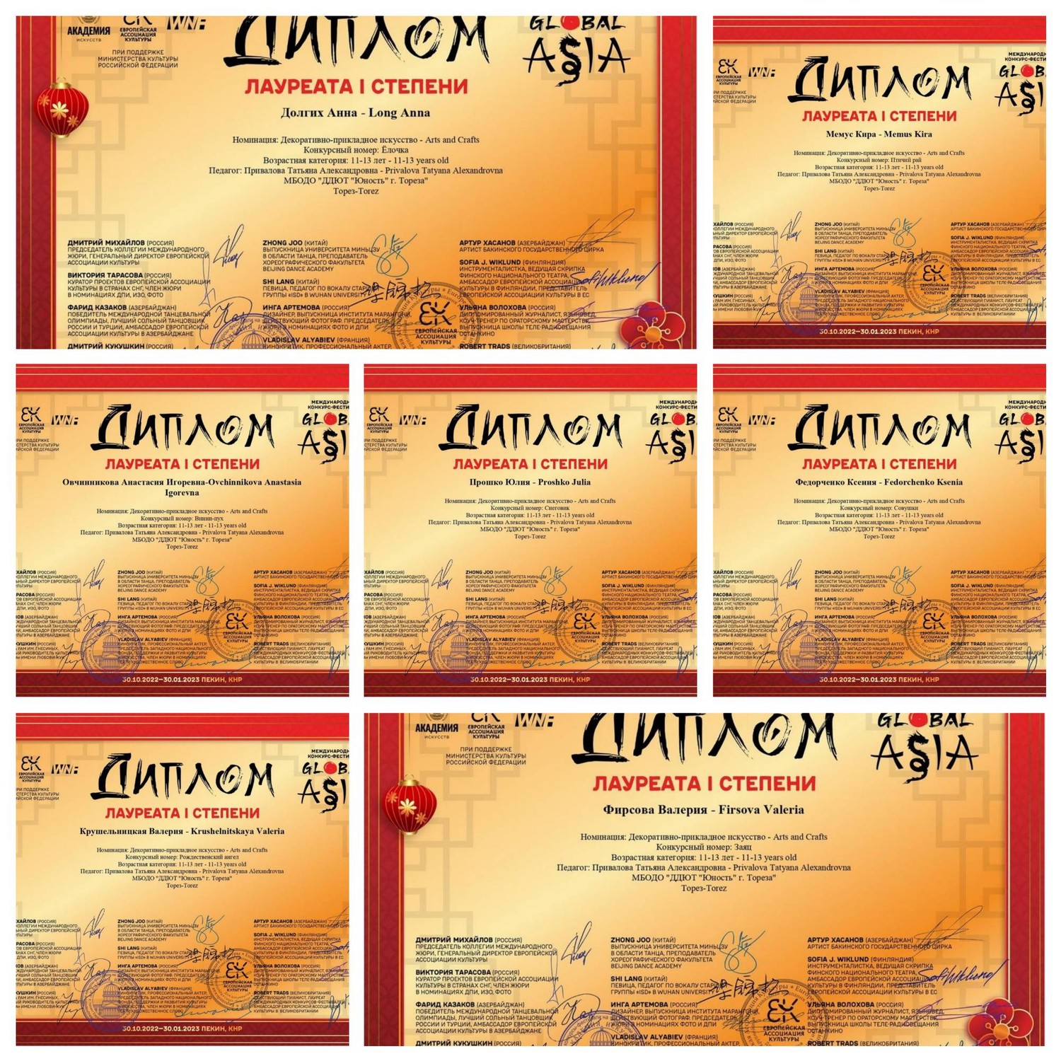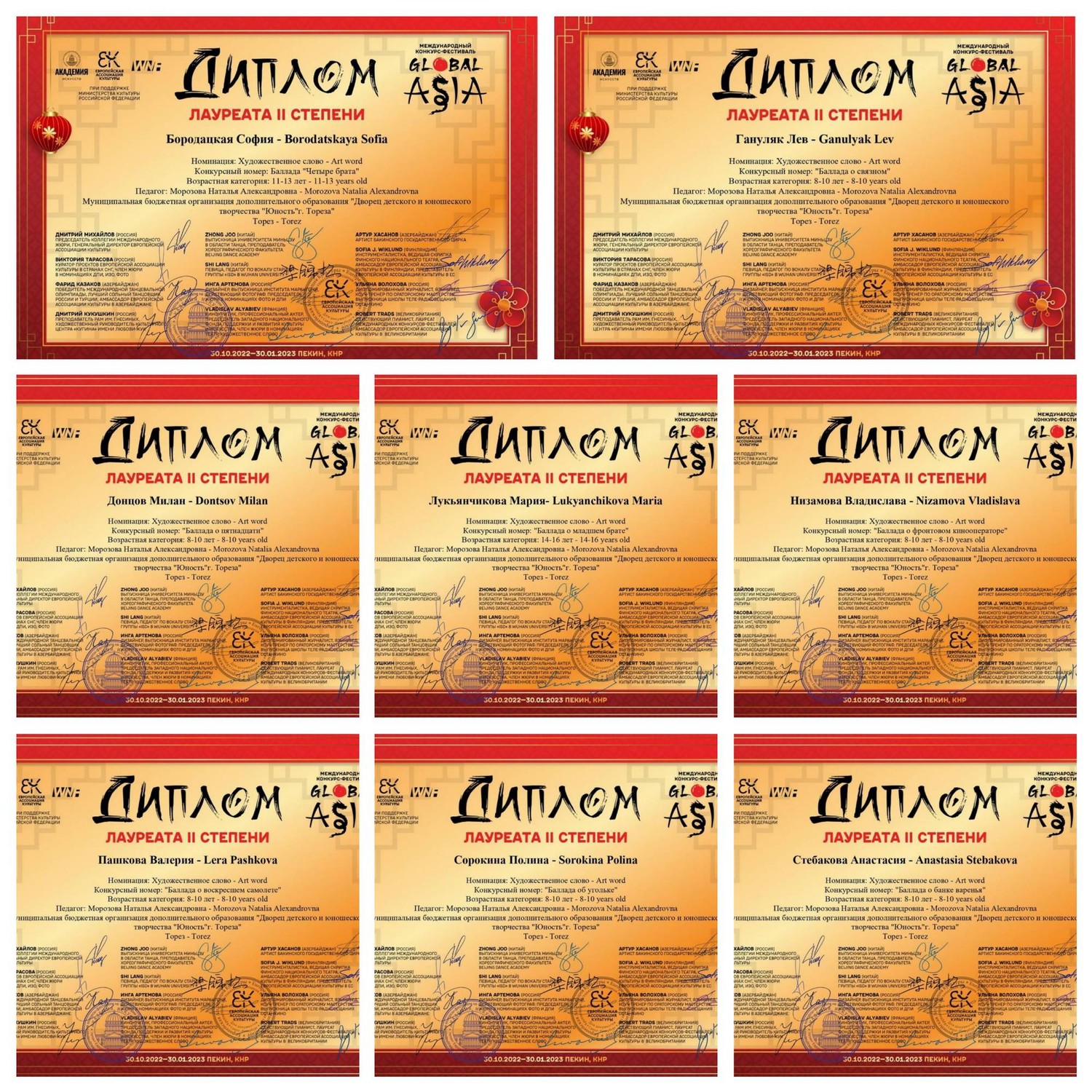 С 30.10 по 16.11 обучающиеся и педагоги МБОДО «ДДЮТ «Юность» приняли участие в дистанционном Международном зарубежном конкурсе-фестивале "Global Asia" 2022 (Китай). Организатор: Европейская Ассоциация Культуры. 1. Информационная поддержка Министерства Культуры; 2. Академия Искусств (Санкт-Петербург); 3. Западный Национальный Фонд поддержки и развития культуры и искусства (Париж, Франция); 4. Информационная поддержка государственного портала "ProCultura"; 5. Международный детский музыкальный конкурс народных исполнителей "МИР" (Музыка и Развитие); 6. Оркестр Яковлева "Grand Melody Orchestra"; 7. АНО "Азбука музыки" Общие цели и задачи: Выявление и всесторонняя поддержка талантливых и перспективных людей; Создание условий для реализации творческого потенциала; Повышение профессиональных навыков руководителей коллективов и педагогов; Обмен профессиональным творческим опытом и укрепление дружественных отношений между участниками из разных регионов России и зарубежья; Способствование объединению детей разных национальностей на принципах мирного сосуществования, толерантности и творческого взаимопонимания. Привлечение внимания со стороны государственных, международных и коммерческих организаций к поддержке творческого воспитания среди всех слоев населения. В копилку Дворца внесено 69 первых мест (из них 14 первых мест у педагогов) и 28 вторых мест! Народный ансамбль современного танца «Баттерфляй» (педагог Степанова Ю.Э.): 9 лауреатов 1-ой степени – «Скерцо», «Пароход», «Рождественская мистерия», «Баварская вечеринка», «Я-огонь, ты-вода», «Шоумен», «Либеральное танго», «Хранители времени», 2 лауреата 2-ой степени – «Невеста», «Мы самые». Театральная студия «МХАТик» (педагог Морозова Н.А.): 15 лауреатов 1-ойстепени – Бородацкая София, Григорусь Вероника (2 диплома), Попова Дарья, Диденко Алиса (2 диплома), Карач Дарья, Крючкова Валерия, Черткова Вероника, Сорокина Диана, Михалёва Мария, Пономарёва Екатерина, спектакли – «Дети во время войны», «Сказки на всякий случай», «Ещё не взрослые, уже не дети», 8 лауреатов 2-ой степени – Бородацкая София, Пашкова Валерия, Стебакова Анастасия, Донцов Милан, Сорокина Полина, Лукьянчикова Мария, Гануляк Лев, Низамова Владислава. Народный ансамбль эстрадной песни «Тоника» (педагог Гужель В.А.): 6 лауреатов 1-ой степени – Рымар Мария, Зайцева Маргарита, Селионова Алина, Белоусова Евгения, Абдулаева Эмилия, квартет, Лауреат 2-ой степени – Казанцева Дарья. Народный художественный коллектив «Волшебная ниточка» (педагог Привалова Т.А.): 7 дипломов за работы педагогу Приваловой Т.А., 7 лауреатов 1-ой степени – Овчинникова Анастасия, Прошко Юлия, Мемус Кира, Фирсова Валерия, Долгих Анна, Федорченко Ксения, Крушельницкая Валерия, 3 лауреата 2-ой степени – Долгих Юлия, Тимченко Маргарита, Чернявская Полина. Образцовый художественный коллектив «Школа красоты» (педагог Москалёва Е.В.): Диплом победителя руководителю Москалевой Е.В., 2 лауреата 1-ой степени – Иким Виктория, Бояринцева Анастасия, 7 лауреатов 2-ой степени – Дьяченко София, Борцова Дарья, Гануляк Лев, Овчинникова Анастасия, Савченко Дарина, Тимченко Екатерина, Якимчук Арина. Школы раннего развития «Город друзей» и «Супер детки» (педагог Цымбаленко И.О.): Диплом за 1 место педагогу Цымбаленко И.О. за мастер-класс, 7 лауреатов 2-ой степени – «День поэзии», «Визитная карточка», Малина Екатери