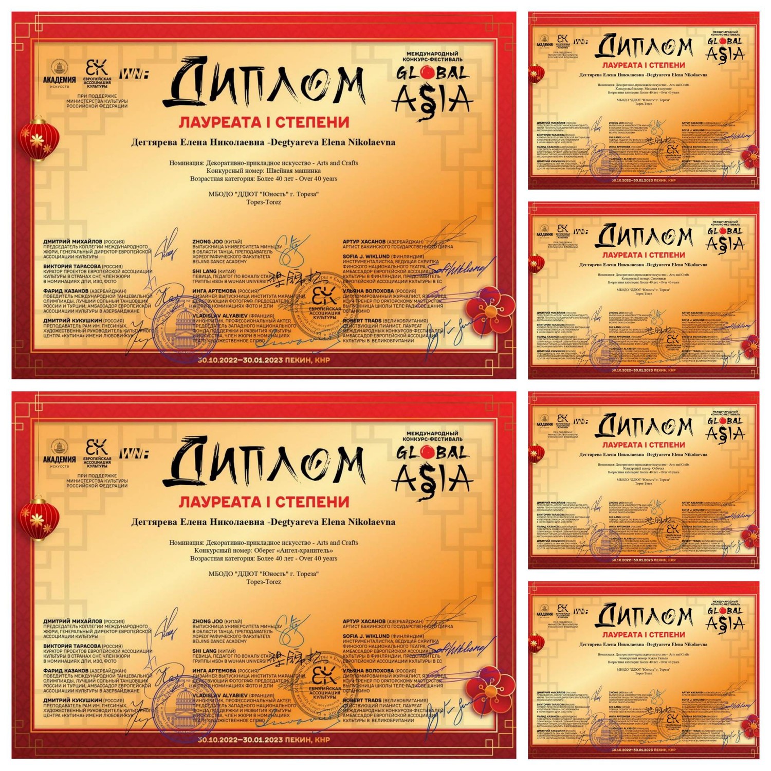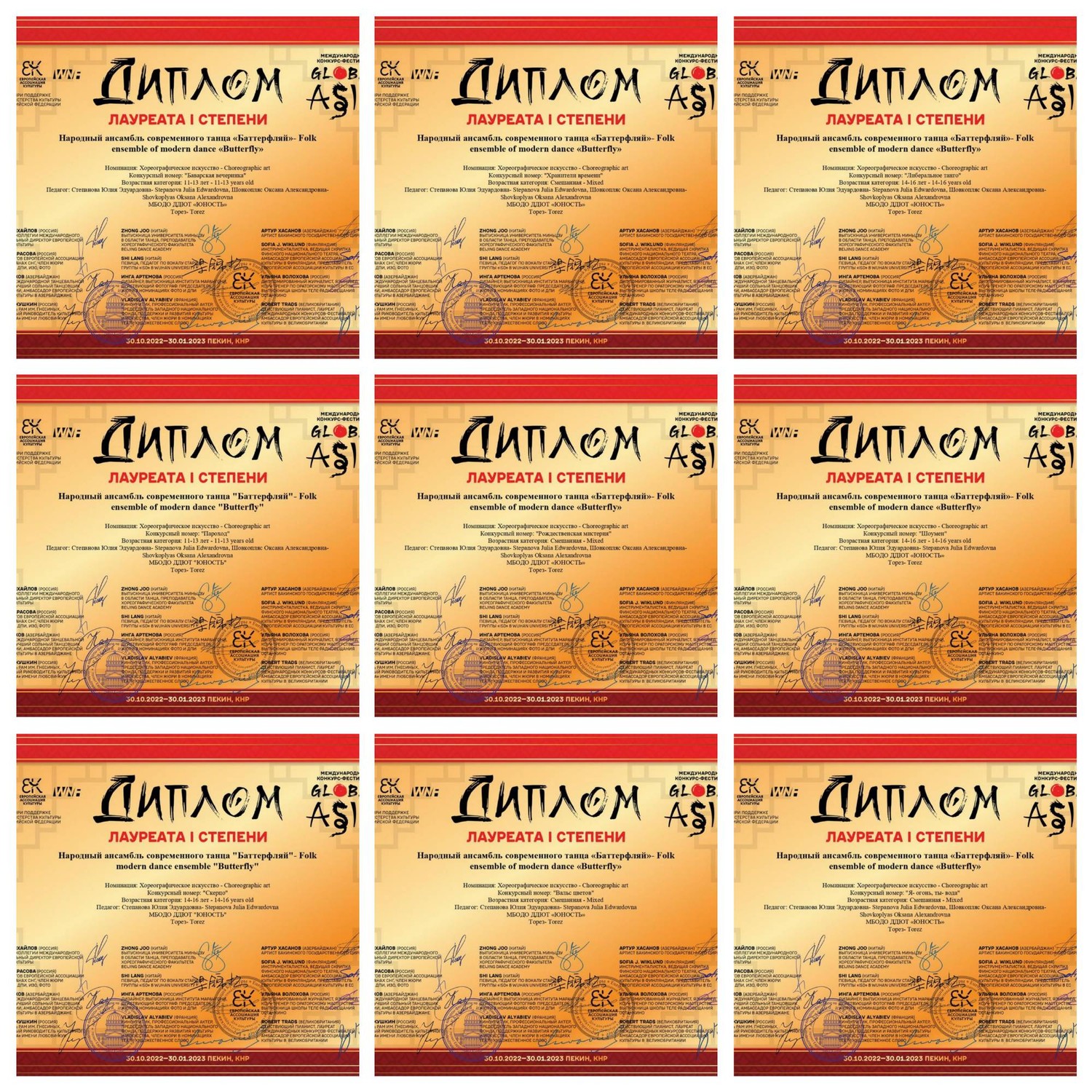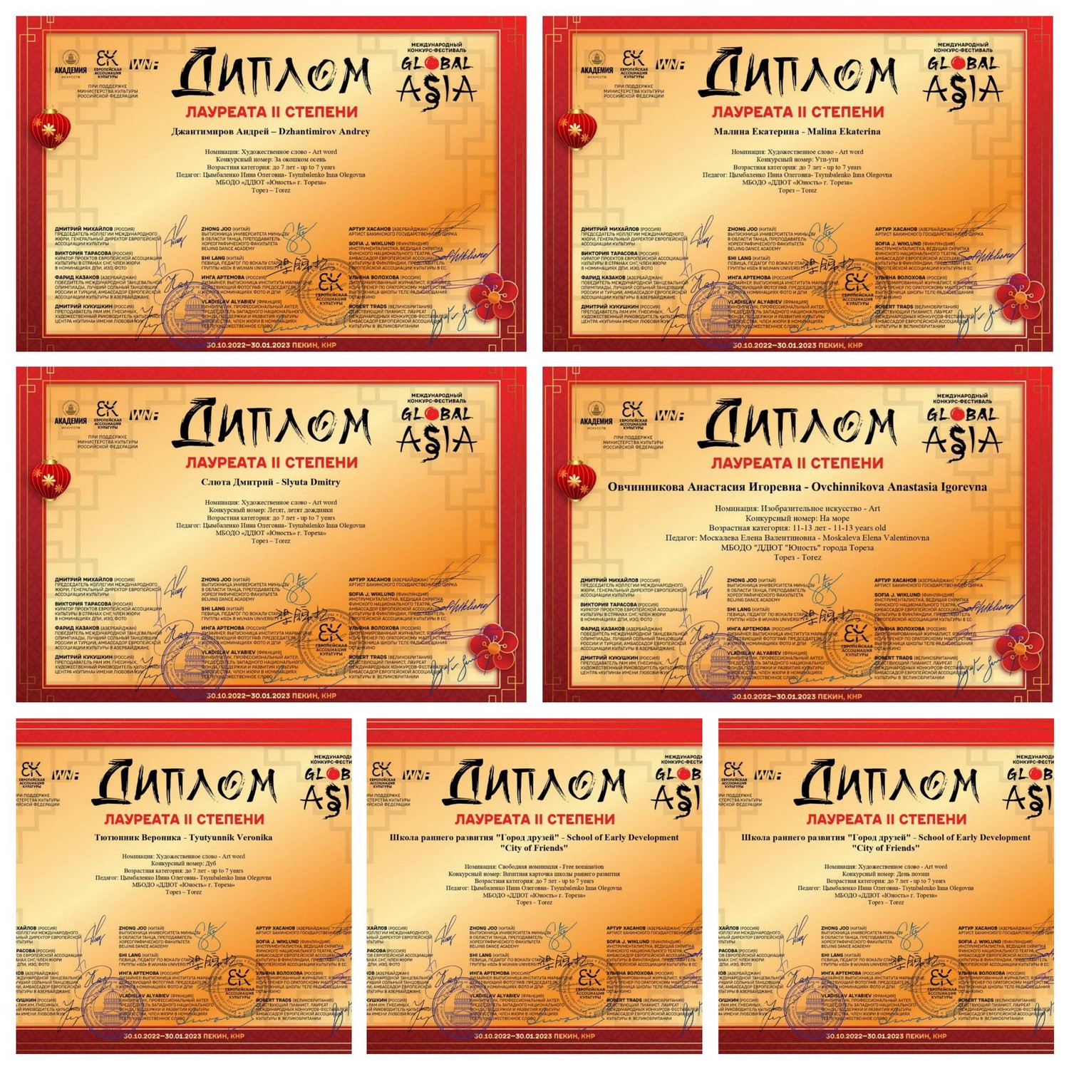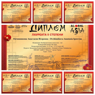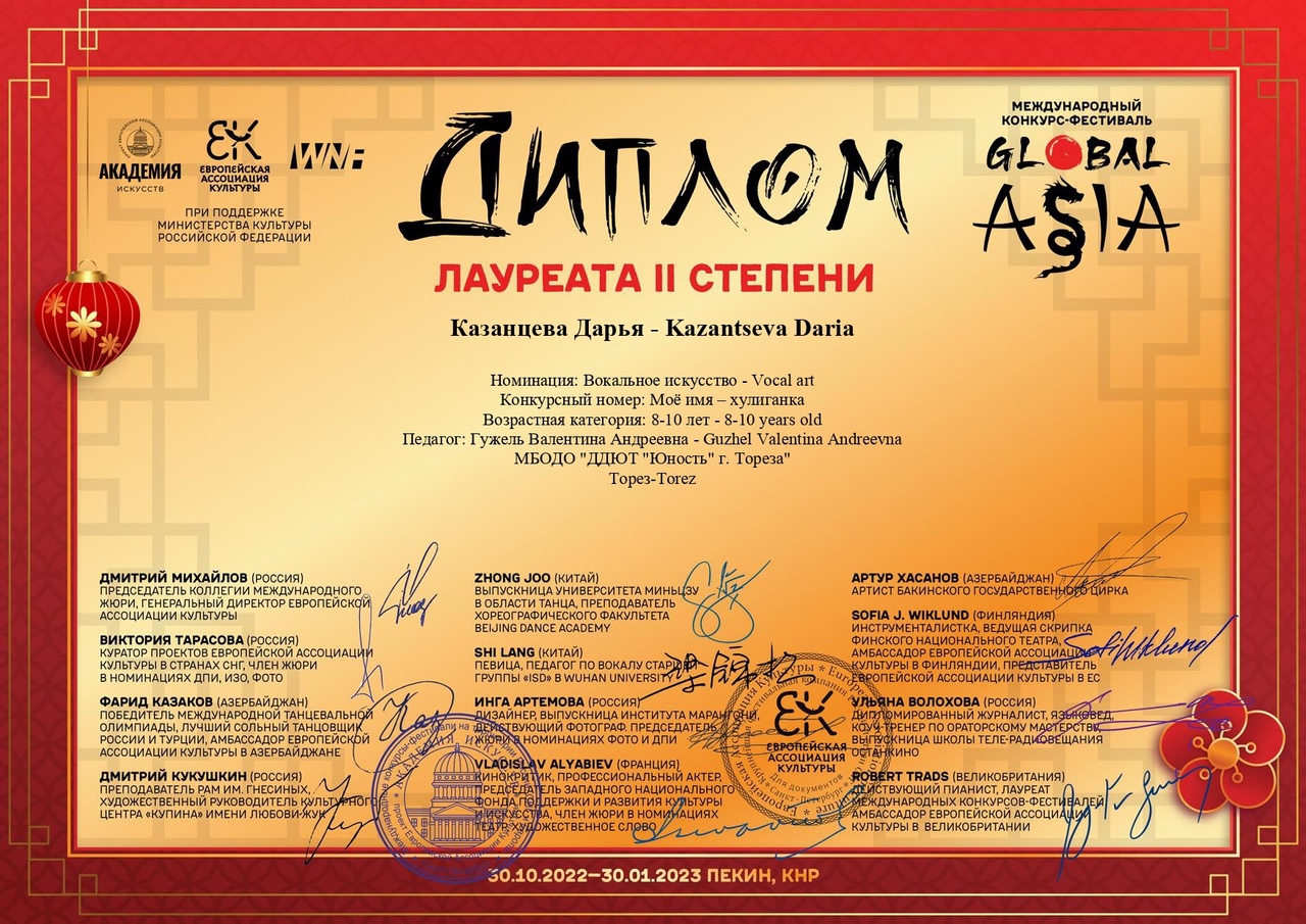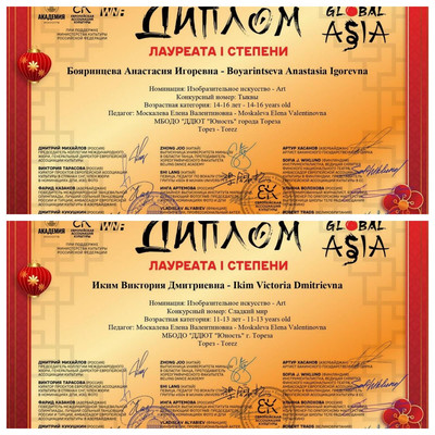 С 30.10 по 16.11 обучающиеся и педагоги МБОДО «ДДЮТ «Юность» приняли участие в дистанционном Международном зарубежном конкурсе-фестивале "Global Asia" 2022 (Китай). Организатор: Европейская Ассоциация Культуры. 1. Информационная поддержка Министерства Культуры; 2. Академия Искусств (Санкт-Петербург); 3. Западный Национальный Фонд поддержки и развития культуры и искусства (Париж, Франция); 4. Информационная поддержка государственного портала "ProCultura"; 5. Международный детский музыкальный конкурс народных исполнителей "МИР" (Музыка и Развитие); 6. Оркестр Яковлева "Grand Melody Orchestra"; 7. АНО "Азбука музыки" Общие цели и задачи: Выявление и всесторонняя поддержка талантливых и перспективных людей; Создание условий для реализации творческого потенциала; Повышение профессиональных навыков руководителей коллективов и педагогов; Обмен профессиональным творческим опытом и укрепление дружественных отношений между участниками из разных регионов России и зарубежья; Способствование объединению детей разных национальностей на принципах мирного сосуществования, толерантности и творческого взаимопонимания. Привлечение внимания со стороны государственных, международных и коммерческих организаций к поддержке творческого воспитания среди всех слоев населения. В копилку Дворца внесено 69 первых мест (из них 14 первых мест у педагогов) и 28 вторых мест! Народный ансамбль современного танца «Баттерфляй» (педагог Степанова Ю.Э.): 9 лауреатов 1-ой степени – «Скерцо», «Пароход», «Рождественская мистерия», «Баварская вечеринка», «Я-огонь, ты-вода», «Шоумен», «Либеральное танго», «Хранители времени», 2 лауреата 2-ой степени – «Невеста», «Мы самые». Театральная студия «МХАТик» (педагог Морозова Н.А.): 15 лауреатов 1-ойстепени – Бородацкая София, Григорусь Вероника (2 диплома), Попова Дарья, Диденко Алиса (2 диплома), Карач Дарья, Крючкова Валерия, Черткова Вероника, Сорокина Диана, Михалёва Мария, Пономарёва Екатерина, спектакли – «Дети во время войны», «Сказки на всякий случай», «Ещё не взрослые, уже не дети», 8 лауреатов 2-ой степени – Бородацкая София, Пашкова Валерия, Стебакова Анастасия, Донцов Милан, Сорокина Полина, Лукьянчикова Мария, Гануляк Лев, Низамова Владислава. Народный ансамбль эстрадной песни «Тоника» (педагог Гужель В.А.): 6 лауреатов 1-ой степени – Рымар Мария, Зайцева Маргарита, Селионова Алина, Белоусова Евгения, Абдулаева Эмилия, квартет, Лауреат 2-ой степени – Казанцева Дарья. Народный художественный коллектив «Волшебная ниточка» (педагог Привалова Т.А.): 7 дипломов за работы педагогу Приваловой Т.А., 7 лауреатов 1-ой степени – Овчинникова Анастасия, Прошко Юлия, Мемус Кира, Фирсова Валерия, Долгих Анна, Федорченко Ксения, Крушельницкая Валерия, 3 лауреата 2-ой степени – Долгих Юлия, Тимченко Маргарита, Чернявская Полина. Образцовый художественный коллектив «Школа красоты» (педагог Москалёва Е.В.): Диплом победителя руководителю Москалевой Е.В., 2 лауреата 1-ой степени – Иким Виктория, Бояринцева Анастасия, 7 лауреатов 2-ой степени – Дьяченко София, Борцова Дарья, Гануляк Лев, Овчинникова Анастасия, Савченко Дарина, Тимченко Екатерина, Якимчук Арина. Школы раннего развития «Город друзей» и «Супер детки» (педагог Цымбаленко И.О.): Диплом за 1 место педагогу Цымбаленко И.О. за мастер-класс, 7 лауреатов 2-ой степени – «День поэзии», «Визитная карточка», Малина Екатери