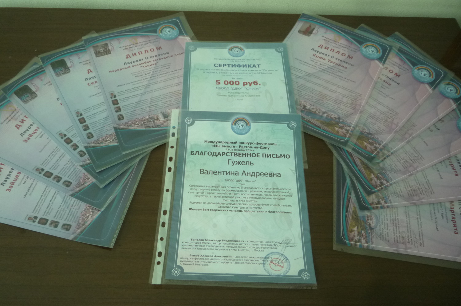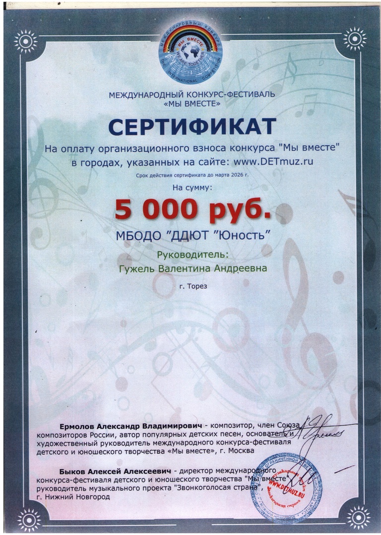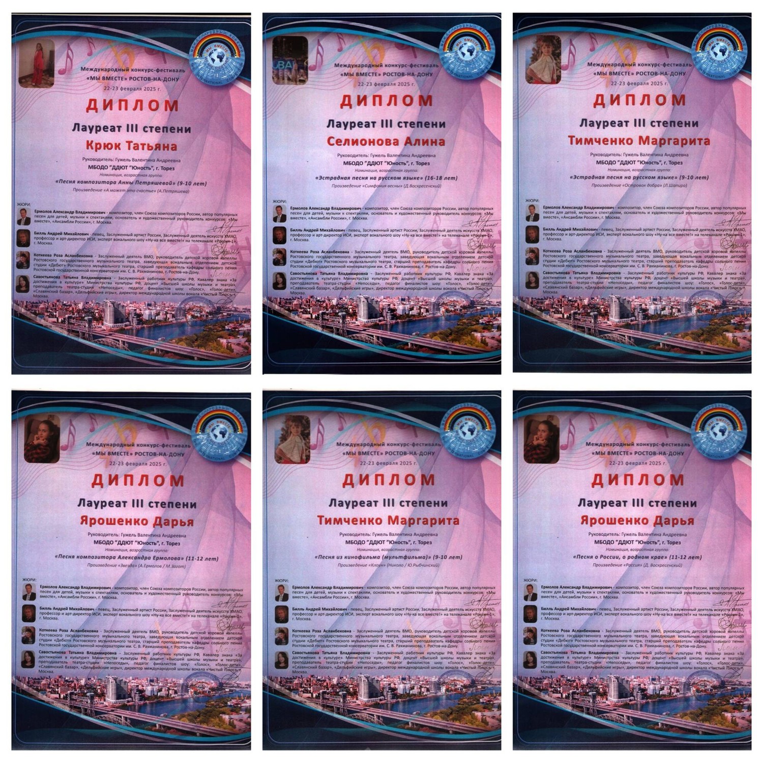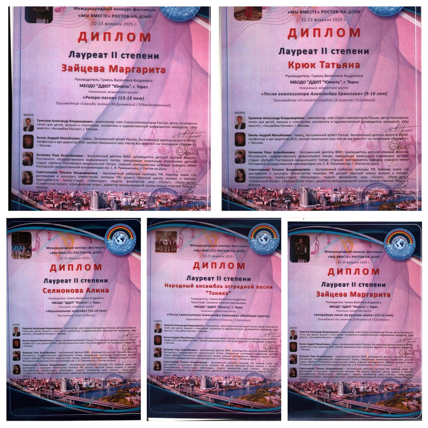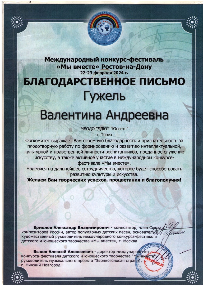 23 февраля народный ансамбль эстрадной песни «Тоника» (педагог Гужель В.А.) принял участие в Международном конкурсе-фестивале композитора Александра Ермолова «Мы вместе», г. Ростов-на-Дону. В составе жюри: Ермолов А.В. (композитор), Биль А.М. (заслуженный артист РФ), Коткеева Р.А. (заслуженный деятель ВМО), Савостьянова Т.В. (заслуженный деятель культуры РФ). Наши замечательные девчонки выдержали очень трудный вокальный конкурс и привезли заслуженные награды. Итоги конкурса – 5 вторых и 6 третьих места! 2-е место – Зайцева Маргарита («Спасибо, жизнь», «Ах, мамочка»), Крюк Татьяна («О планете голубой»), Селионова Алина («Снег»), младший ансамбль («Пой всегда», хореограф Самарина Кристина Валерьевна). 3-е место – Тимченко Маргарита («Клоун», «Островок добра»), Ярошенко Дарья («Россия», «Звезда»), Селионова Алина («Симфония весны»), Крюк Татьяна («А может это счастье»). Коллектив был приглашён на творческий вечер с композиторов А. Ермоловым. Педагог награждена благодарственным письмом. Ансамбль награждён денежным сертификатом – скидкой на следующий конкурс. Поздравляем и желаем творческих успехов! | |