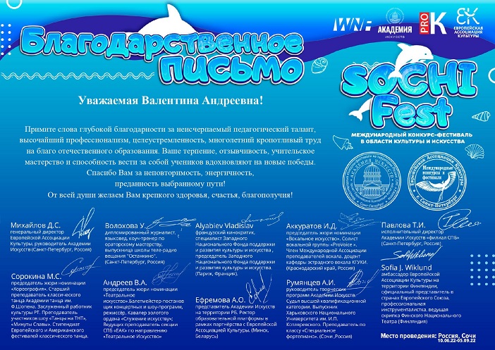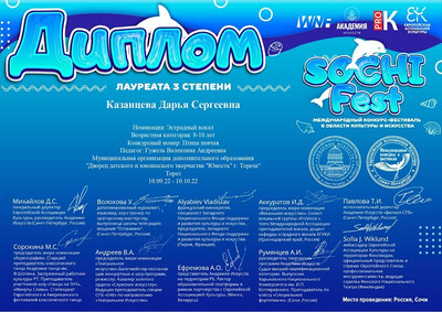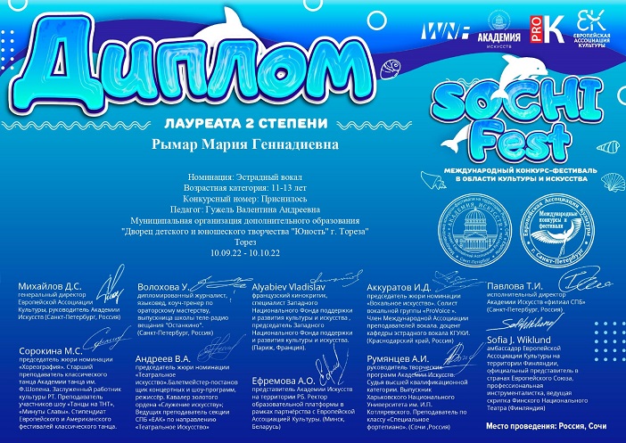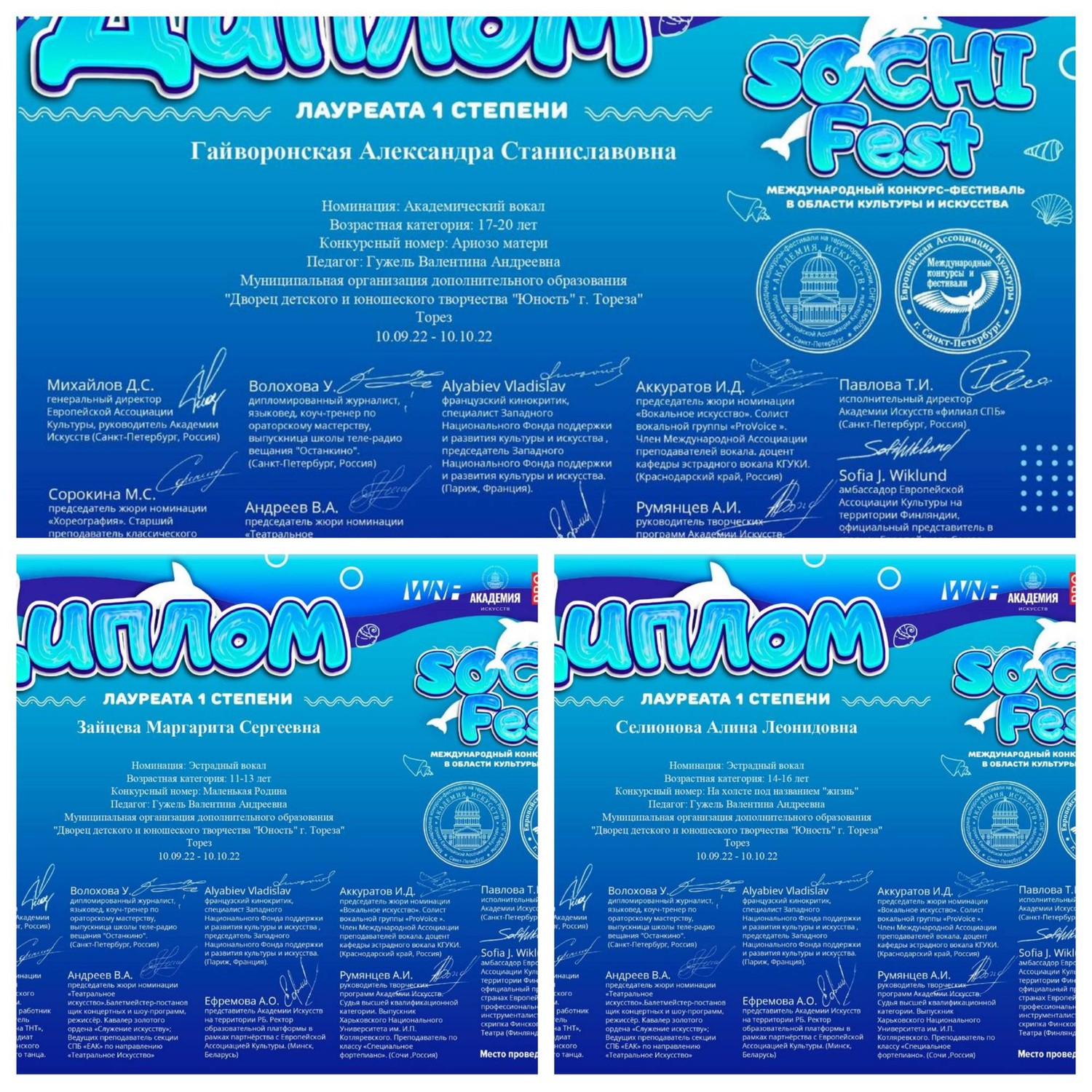 Обучающиеся народного ансамбля эстрадной песни «Тоника» (педагог Гужель В.А.) МБОДО «ДДЮТ «Юность» приняли участие в дистанционном Международном конкурсе-фестивале в области искусства и культуры «Sochi Fest-2022» (г. Сочи, Россия). Конкурс проходил при информационной поддержки Министерства культуры и государственного информационного портала PRO.Культура.рф, Европейской Ассоциации Культуры, фонда «WNF FRANCE». Цели и задачи конкурса-фестиваля: -выявление и всесторонняя поддержка талантливых и перспективных людей; -создание условий для реализации творческого потенциала; -повышение профессиональных навыков руководителей коллективов и педагогов; -обмен профессиональным творческим опытом и укрепление дружественных отношений между участниками из разных регионов России и зарубежья; -содействие объединению детей разных национальностей на принципах мирного сосуществования, толерантности и творческого взаимопонимания. Оценивало конкурсные номера высокопрофессиональное жюри, в состав которого вошли известные деятели культуры и искусств Российской Федерации и стран СНГ, ведущие педагоги лучших ВУЗов, композиторы, хореографы, вокалисты. Итоги конкурса: 1-е места – Гайворонская Александра, Зайцева Маргарита и Селионова Алина, 2-е место – Рымар Мария, 3-е место – Казанцева Дарья. Педагог награждена благодарственным письмом за подготовку участников конкурса. Это отличное начало нового учебного года! Поздравляем! Молодцы! | |