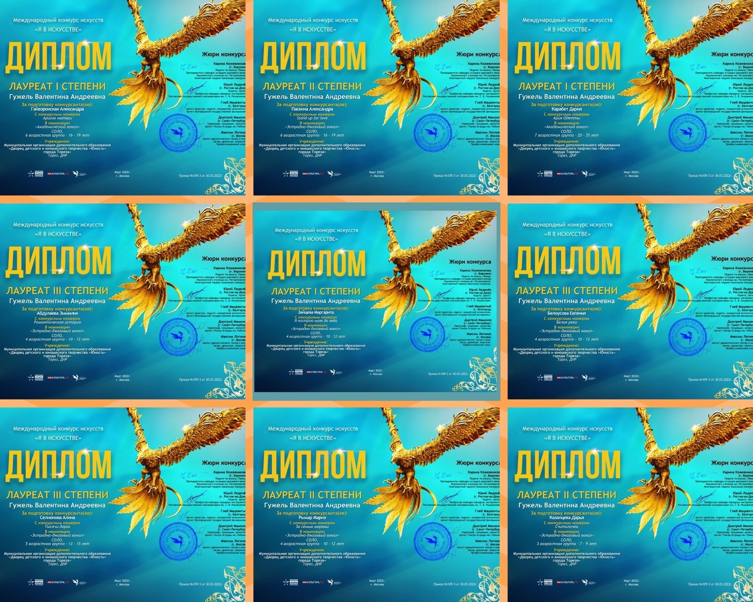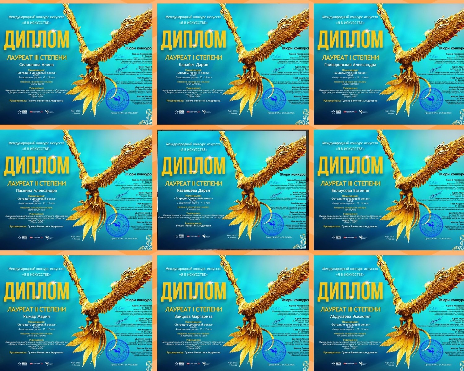 С 15 по 23 марта обучающиеся народного ансамбля эстрадной песни «Тоника» (педагог Гужель В.А.) приняли участие в дистанционном конкурсе искусства «Я в искусстве» (г. Москва). Учредитель и организатор конкурса: Творческое объединение «Возрождение искусств». При информационной поддержке: • Государственного портала культурного наследия России PROКультура.РФ • Международного форума композиторов и поэтов-песенников (г. Москва). Цели и задачи конкурса: - Выявление талантливых детей и молодежи в области исполнительских искусств. - Воспитание культуры, интереса и уважения к исполнительскому искусству. - Повышение уровня профессионального мастерства руководителей творческих коллективов, педагогов и исполнителей. - Определение уровня мастерства и профессионализма творческих коллективов и исполнителей. Итоги конкурса: 3 лауреата 1-ой степени – Зайцева Маргарита, Гайворонская Александра, Карабет Дария; 3 лауреата 2-ой степени – Паскина Александра, Рымар Мария, Казанцева Дарья; 3 лауреата 3-ей степени – Селионова Алина, Абдулаева Эммилия, Белоусова Евгения. Руководитель Гужель Валентина Андреевна награждена девятью благодарственными письмами за каждого участника. Поздравляем руководителя и участников с отличными результатами! | |