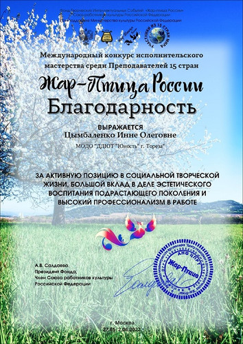 Цымбаленко И.О. приняла участие в Международном конкурсе исполнительского мастерства среди преподавателей 15 стран (г. Москва) от Фонда Творческих Интеллектуальных Событий «Жар-птица России». За мастер-класс «Создание викторины с помощью LEANING APPS» педагог награждена дипломом лауреата 1-ой степени и благодарственным письмом. Поздравляем! | |