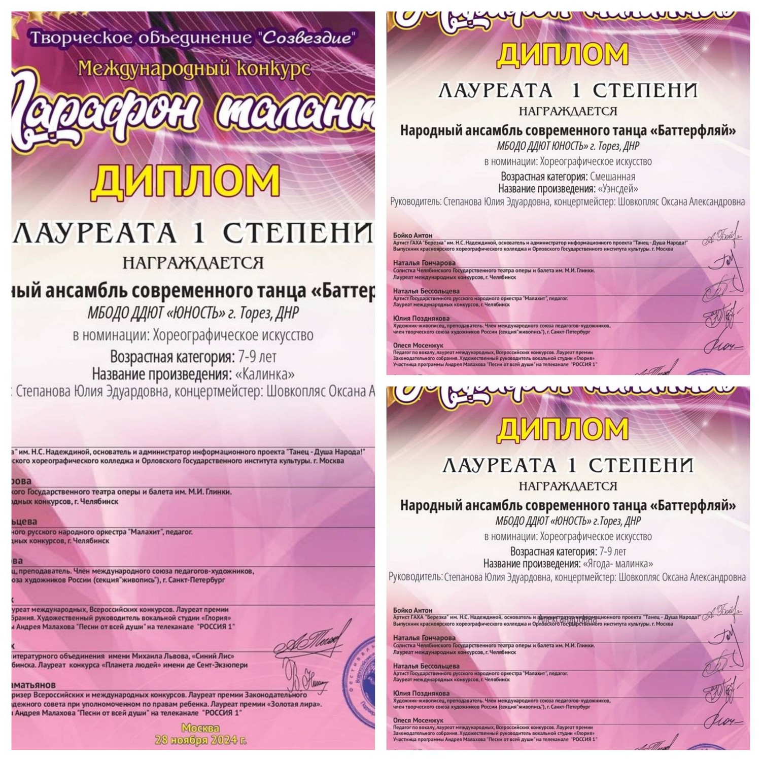 28.11.2024 г. три возрастные группы Народного ансамбля современного танца "Баттерфляй" приняли участие в Международном конкурсе "Марафон талантов" от творческого объединения "Созвездие" (г. Москва"). Все номера программы были по достоинству оценены профессиональным жюри. Лауреат 1-й степени- композиция "Калинка" (младшая группа) Лауреат 1-й степени- композиция "Уэнсдей" (старшая группа) Лауреат 1-й степени- композиция "Ягода- малинка" (средняя группа). Поздравляем наших танцоров с заслуженной победой! Не останавливайтесь на достигнутом! Ждём новых побед! | |