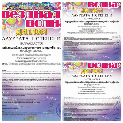 1 ноября 2024 г. народный ансамбль современного танца "Баттерфляй" (педагог Степанова Ю.Э.) принял участие в Международном конкурсе "Звездная волна" от творческого объединения "Созвездие" (г. Москва). Лауреат I степени- композиция "Ворона" Лауреат I степени- композиция "У самовара" Лауреат I степени- композиция "Фрейлины" Руководителям вручены благодарственные письма.
