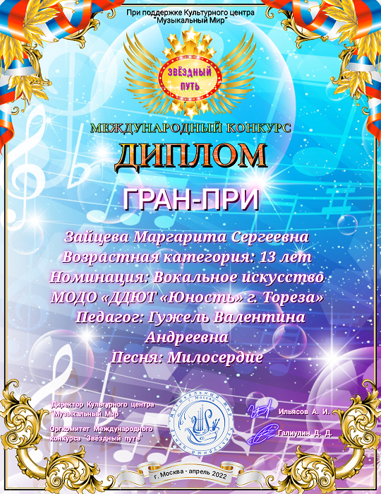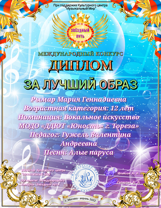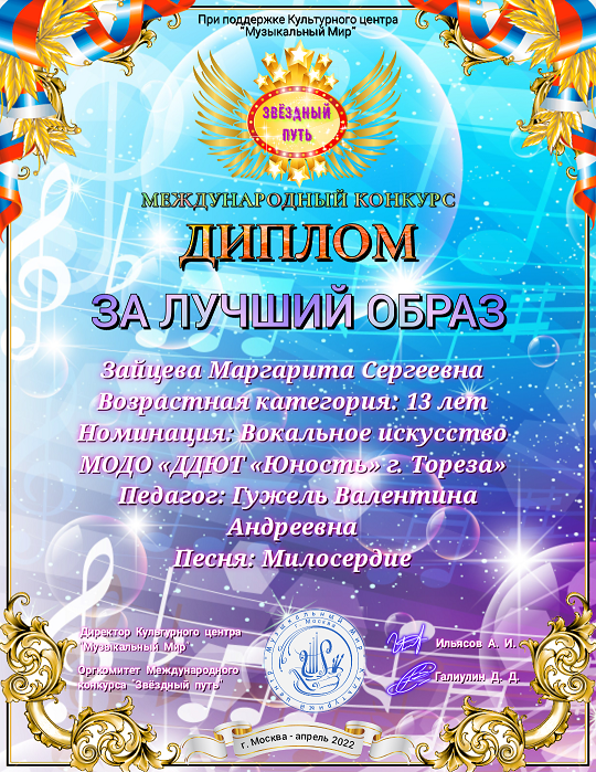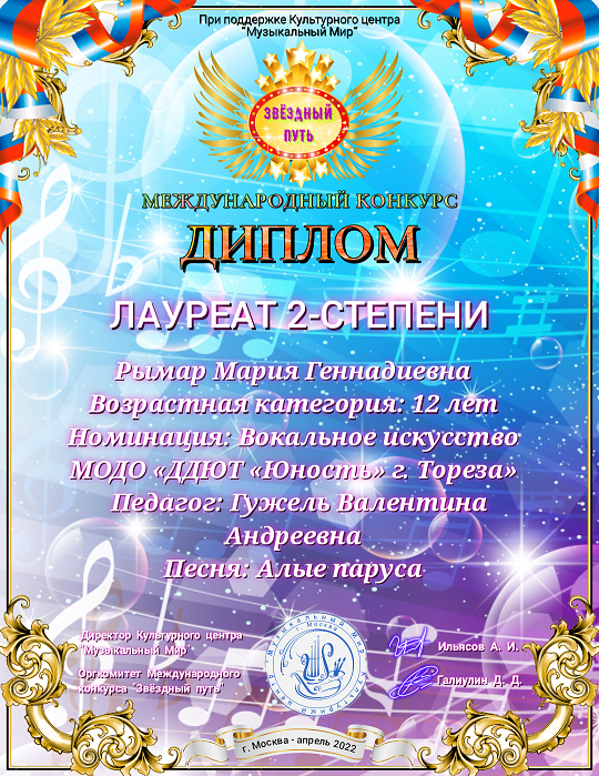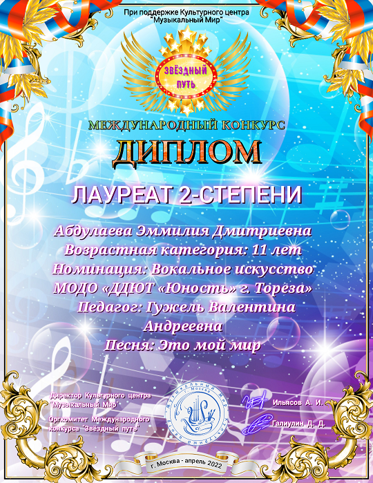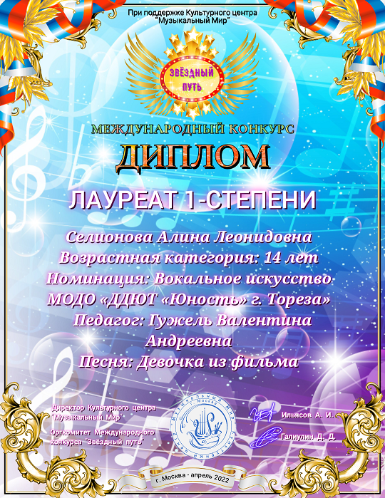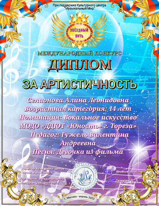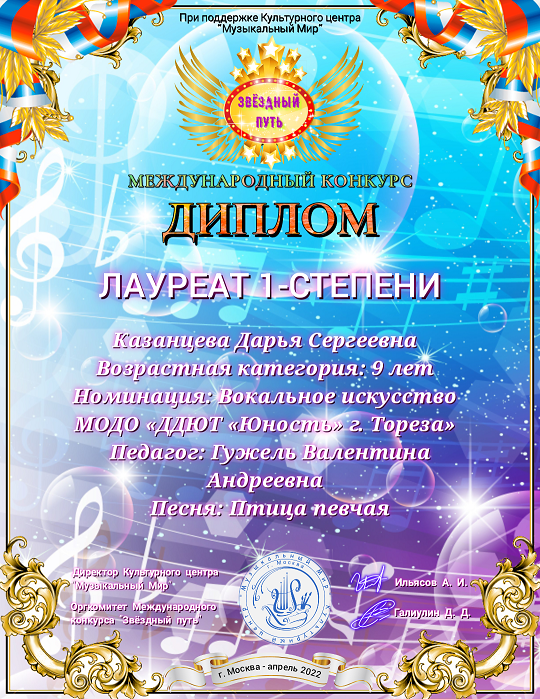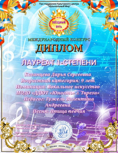 Обучающиеся народного ансамбля эстрадной песни «Тоника» (педагог Гужель В.А.) МОДО «ДДЮТ «Юность» приняли участие в Международном конкурсе «Звёздный путь», проведённого культурным центром «Музыкальный мир» (г. Москва). Цели и задачи культурного центра «Музыкальный мир»: Онлайн-конкурсы, фестивали, концерты, проводимые культурным центром «Музыкальный Мир» проводятся в целях выявления и поддержки талантливой молодежи, популяризации искусства в его исполнительском и педагогическом аспектах, а также с целью открытия новых имен и талантов в области искусств. Также целями конкурса являются: сохранение и развитие традиций многонациональной культуры; знакомство участников с культурным наследием народов мира; повышение профессионального уровня руководителей коллективов; развитие у молодежи толерантности и адекватного понимания других культур, способов самовыражения и проявления человеческой индивидуальности; обмен опытом между коллективами, руководителями и педагогами; поддержка постоянных творческих контактов между ними, их объединение в рамках фестивального движения; создание атмосферы для профессионального общения участников конкурса, обмена опытом и репертуаром; привлечение продюсеров и организаторов концертов для последующих контактов с коллективами и солистами – участниками конкурса; привлечение внимания со стороны государственных, международных, коммерческих и общественных организаций к проблемам творческих коллективов и исполнителей; освещение творчества детей и молодежи в средствах массовой информации. Партнёры конкурса: Студия звуко-видеозаписи «ZAMIS», дизайнерская студия «Mr.Archer». Итоги конкурса: 1 Гран-при, 3 лауреата 1-ой степени и 2 лауреата 2-ой степени! Гран-при – Зайцева Маргарита (композиция «Милосердие») и именной диплом «За лучший образ»; Лауреат 1-ой степени – Казанцева Дарья (композиция «Птица певчая») и именной диплом «За лучший образ»; Лауреат 1-ой степени – Селионова Алина (композиция «Девочка из фильма») и именной диплом «За артистичность»; Лауреат 1-ой степени – Юркина Елизавета (композиция «Серёжка ольховая»); Лауреат 2-ой степени – Рымар Мария (композиция «Алые паруса») и именной диплом «За лучший образ»; Лауреат 2-ой степени – Абдулаева Эммилия (композиция «Это мой мир»). Поздравляем участников и педагога с отличными результатами!