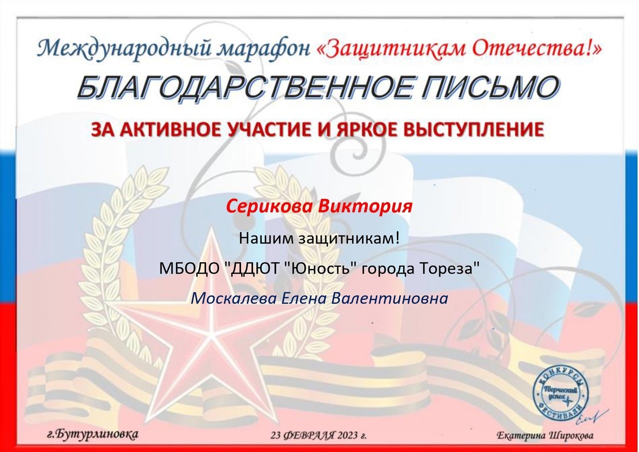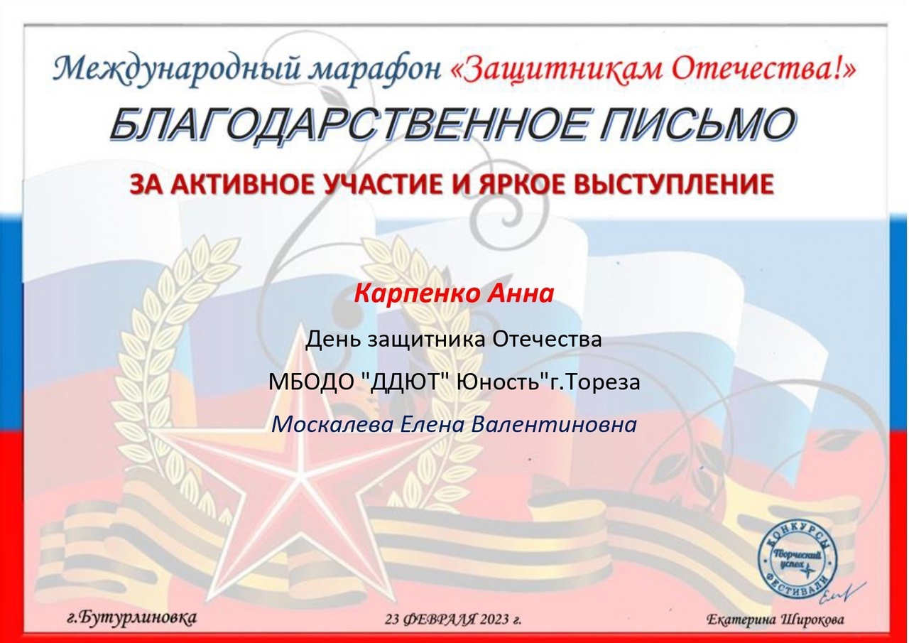 23 февраля обучающиеся ТО МБОДО «ДДЮТ «Юность» приняли участие в Международном марафоне «Защитники Отечества» (г. Бутурлинка). Благодарственные письма получили: Карпенко Анна и Серикова Виктория – образцовый художественный коллектив «Школа красоты», педагог Москалева Е.В.; Терихова Таисия – народный художественный коллектив «Живопись и графика», педагог Даушева Е.В. Поздравляем! | |