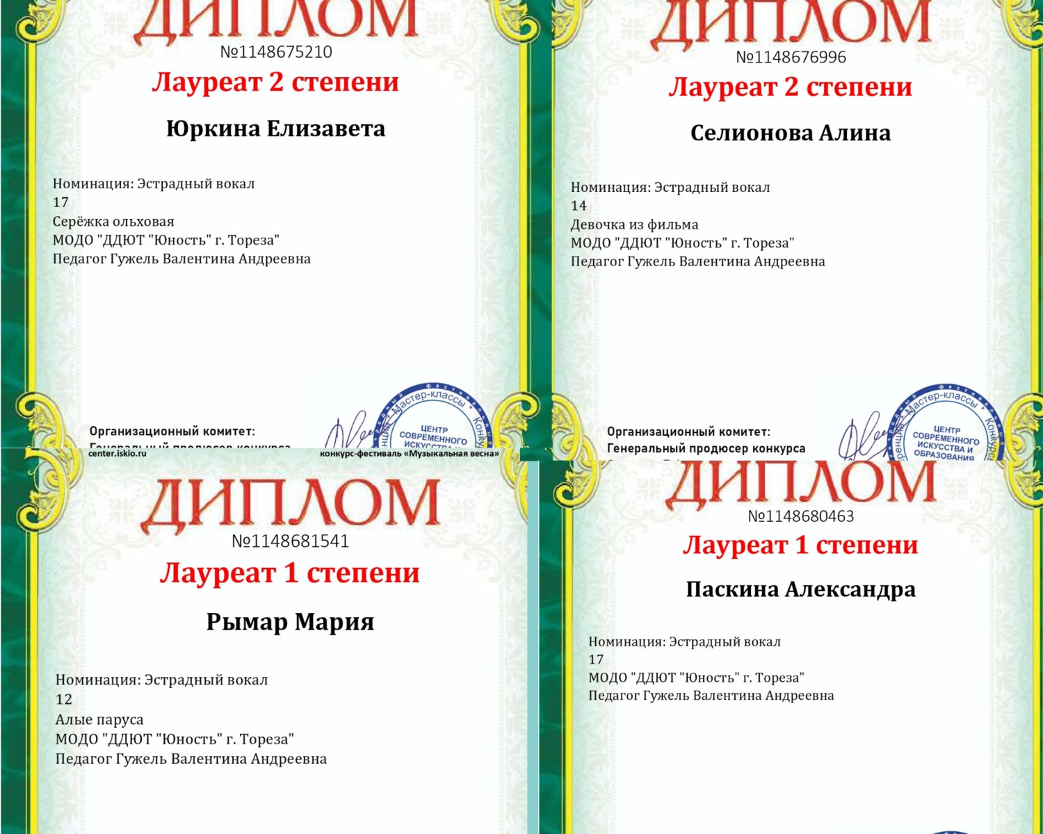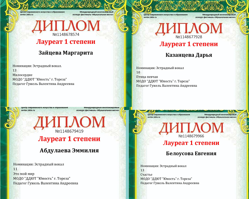 Подведены итоги Международного многожанрового конкурса-фестиваля «Музыкальная весна» от Центра современного искусства и образования (г. Москва), в котором приняли участие солисты народного ансамбля эстрадной песни «Тоника» (педагог Гужель В.А.). Международный многожанровый фестиваль-конкурс «Музыкальная весна» представляет собой конкурс творческих коллективов и исполнителей в разных областях искусства, направленный на: Итоги конкурса (8 дипломов)– 6 лауреатов 1-ой степени и 2 лауреата 2-ой степени! Лауреаты 1-ой степени – Зайцева Маргарита, Казанцева Дарья, Белоусова Евгения, Рымар Мария, Абдулаева Эммилия, Паскина Александра; Лауреаты 2-ой степени – Юркина Елизавета и Селионова Алина. Руководитель награждена благодарственным письмом за подготовку участников конкурса. Поздравляем! Мы вами гордимся! | |