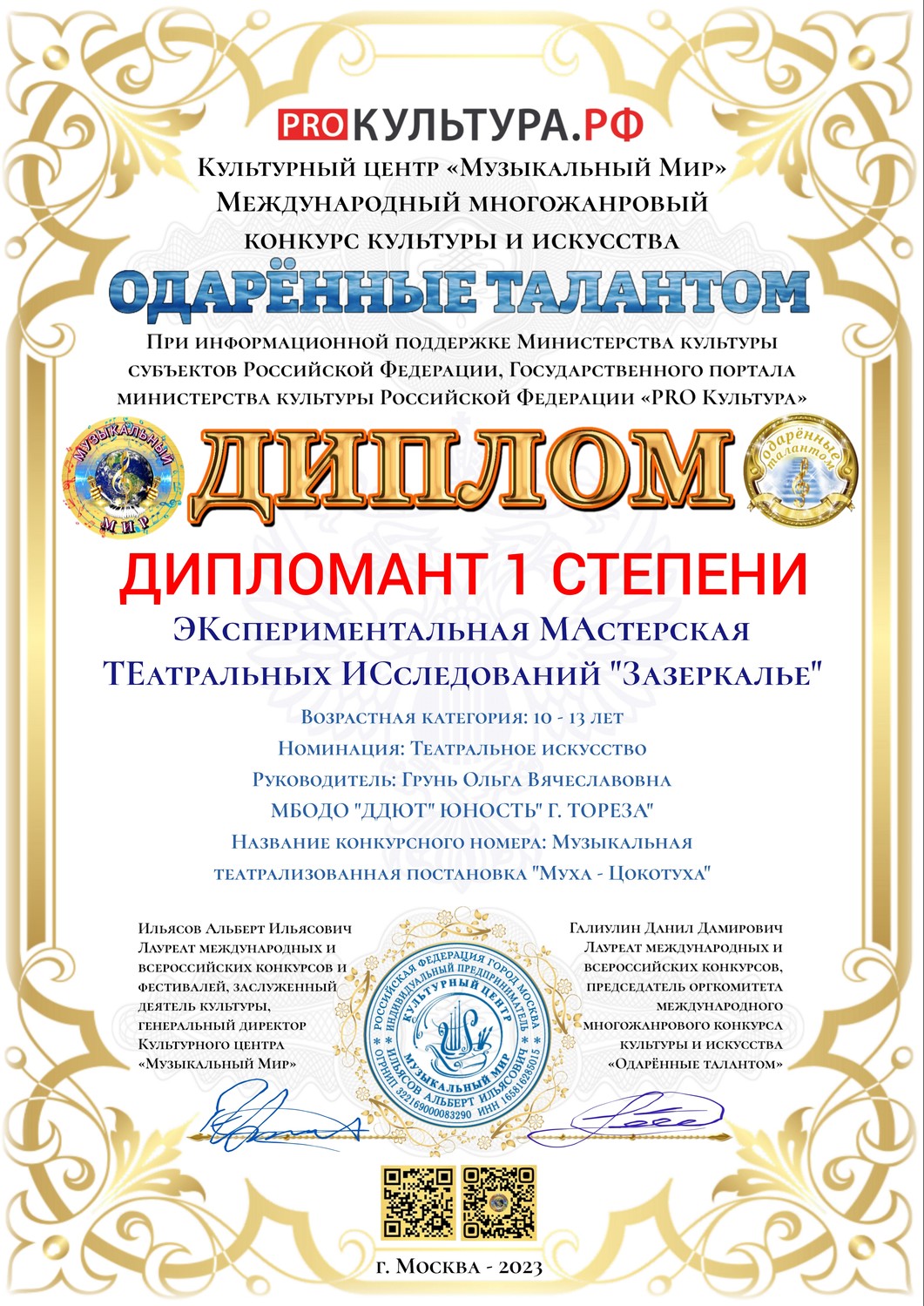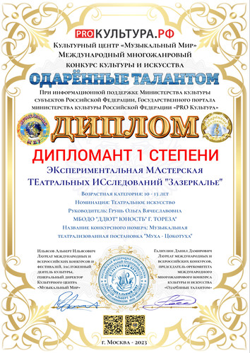 Обучающиеся ТО «Экматеис» (педагог Грунь О.В.) стали дипломантами 1-ой степени в Международном многожанровом конкурсе культуры и искусства «Одарённые талантом». Конкурс проводился дистанционно при информационной поддержке Министерства культуры субъектов РФ, Государственного портала Министерства культуры РФ «PRO-культура». На конкурс была представлена постановка «Муха Цокотуха». Поздравляем и желаем творческих успехов! | |