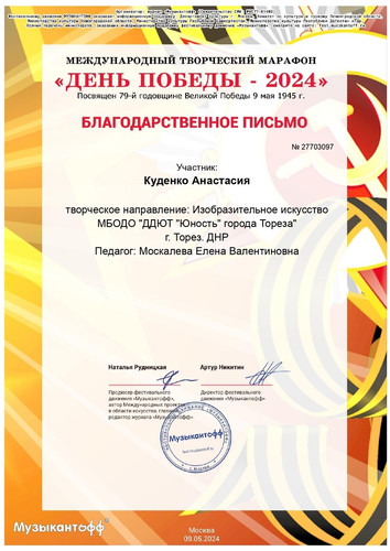 Поздравляем Куденко Анастасию, обучающуюся образцового художественного коллектива «Школа красоты» (педагог Москалева Е.В.) с участием в Международном творческом марафоне «День Победы – 2024» (г. Москва). | |
