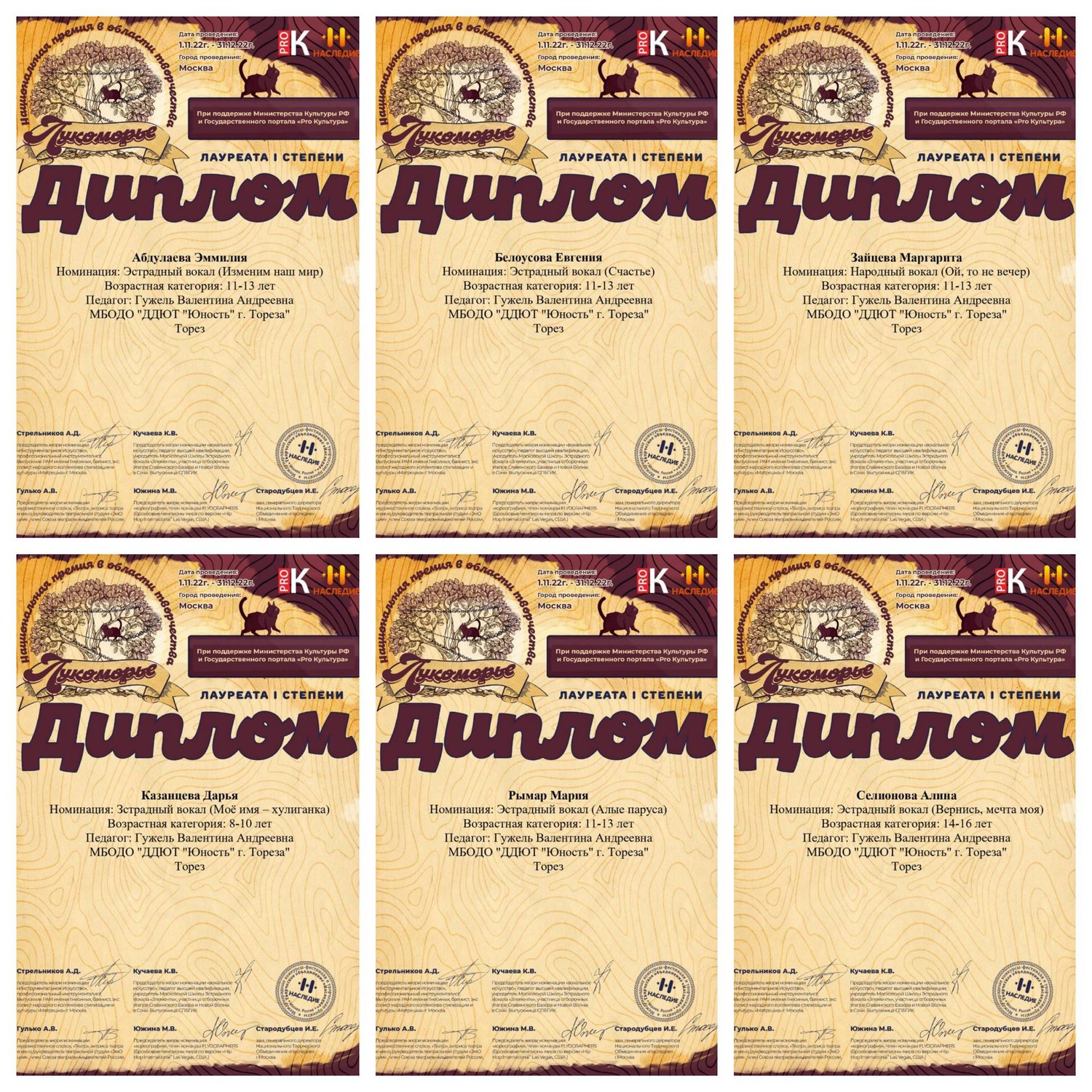 С 7 по 22 ноября творческие коллективы МБОДО «ДДЮТ «Юность» приняли участие в Национальной премии в области творчества «Лукоморье», г. Москва. Цели и задачи конкурса: -Выявление и всесторонняя поддержка наиболее талантливых и перспективных детей и молодежи; -Повышение уровня исполнительского мастерства участников через работу творческих лабораторий и мастер-классов ведущих педагогов России и Европы; -Развитие и сохранение лучших традиций Российской Федерации; -Привлечение внимания со стороны государственных, международных и коммерческих организаций к творческому воспитанию детских домов, детей с ограниченными физическими возможностями; -Создание условий для реализации творческих способностей детей и молодежи; -Повышение профессиональных возможностей руководителей коллективов и педагогов; -Обмен творческим опытом и укрепление дружественных отношений между участниками из различных регионов России и зарубежья; -Способствовать объединению детей разных национальностей на принципах мирного сосуществования, толерантности и творческого взаимопонимания. Итоги конкурса – 10 первых мест! Народный ансамбль эстрадной песни «Тоника» (педагог Гужель В.А.): 1-е места – Рымар Мария, Селионова Алина, Абдулаева Эммилия, Казанцева Дарья, Зайцева Маргарита, Белоусова Евгения; Народный ансамбль современного танца «Баттерфляй» (педагог Степанова Ю.Э.): 1-е места – «Снежная Королева», «Невеста», «Ун моменто», «Шоумен». Руководители награждены благодарственными письмами. Молодцы! Так держать! | |