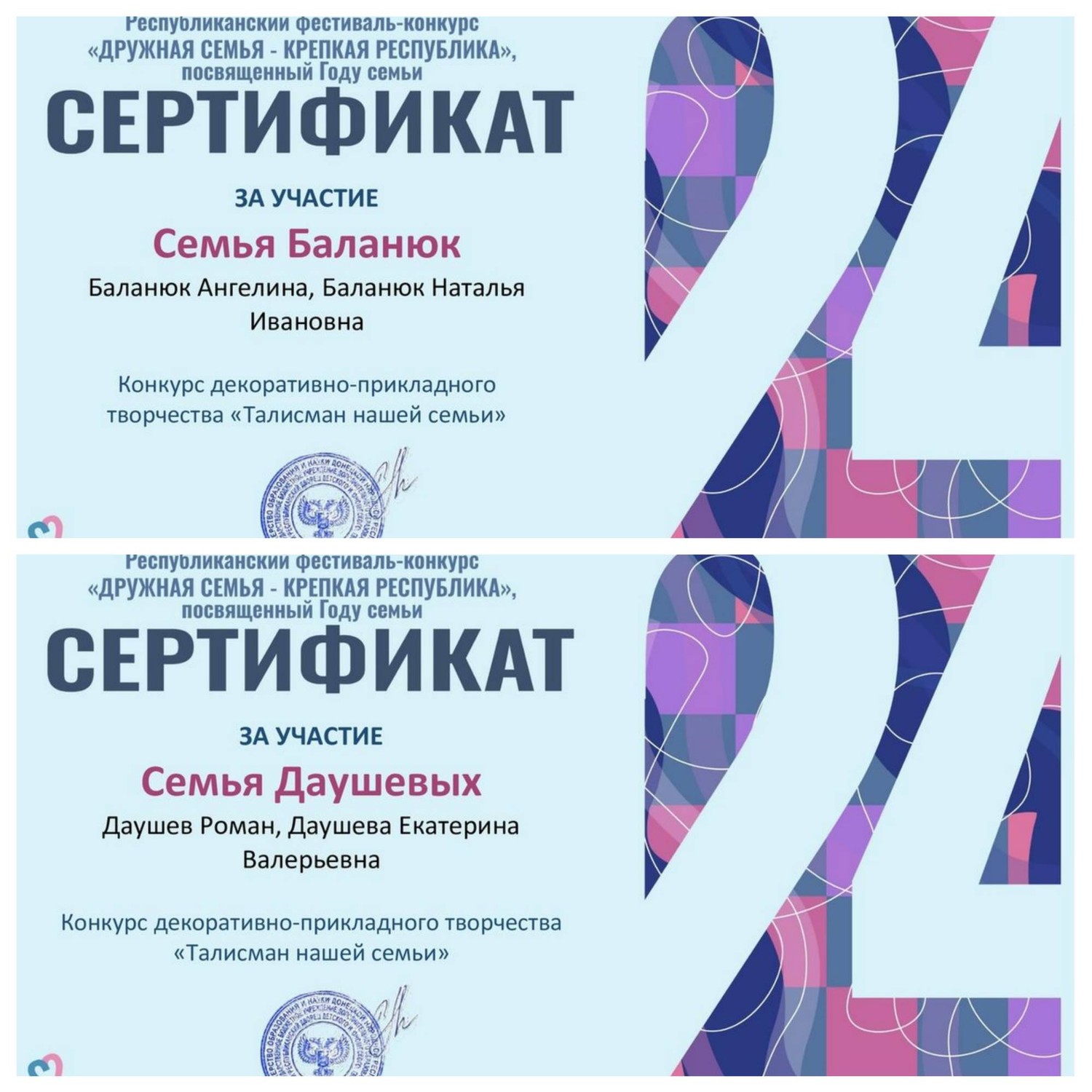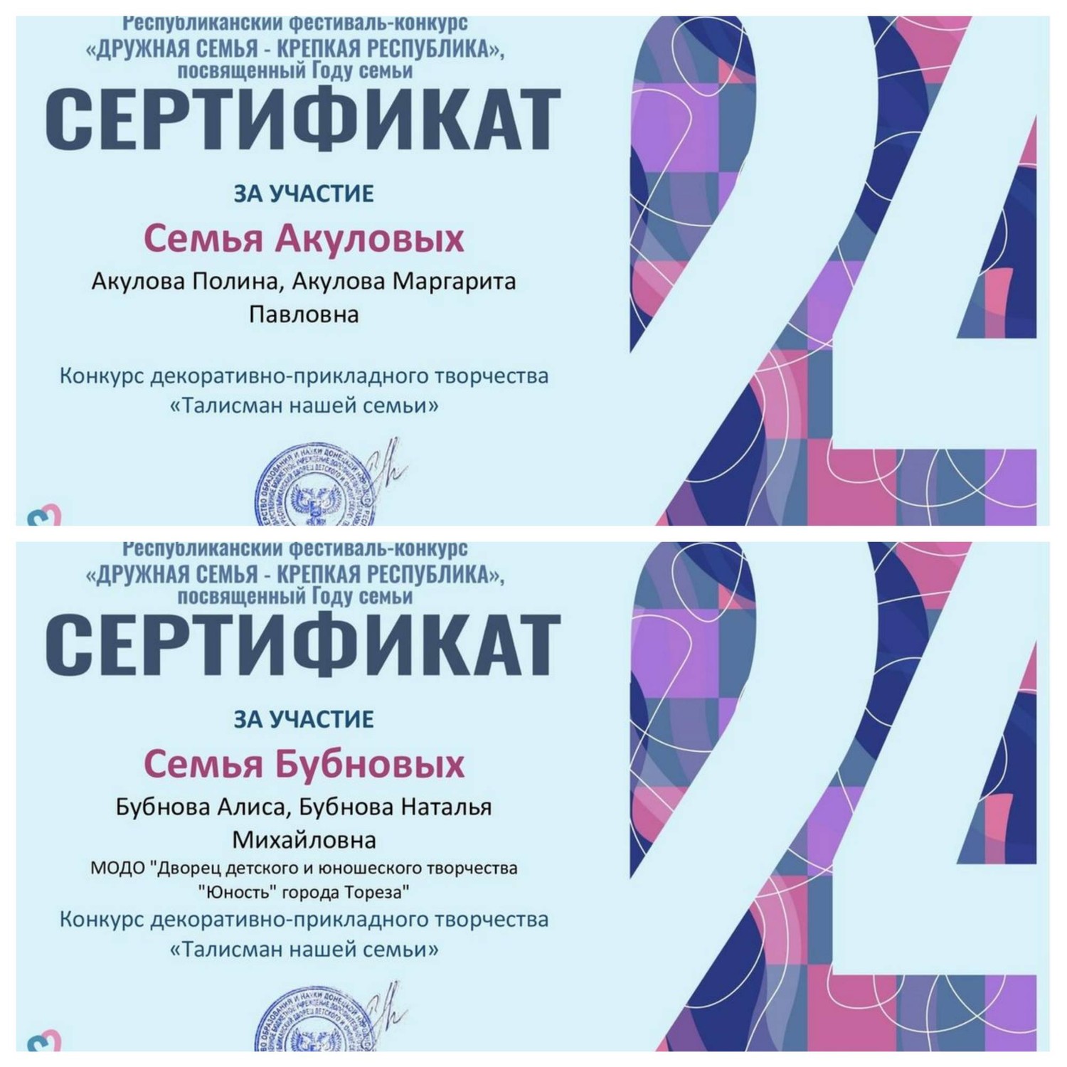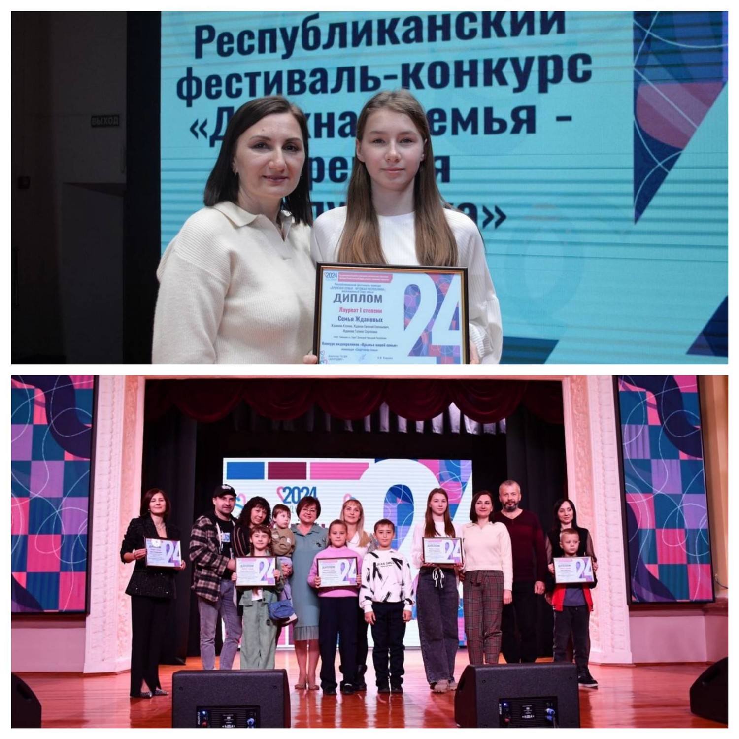 В Донецком Республиканском Дворце детского и юношеского творчества прошло торжественное награждение лауреатов Республиканского конкурса «Дружная семья – крепкая Республика». Семьи обучающихся Дворца творчества «Юность» приняли активное участие в конкурсе. Итоги конкурса: 1-е место – семья Ждановых (номинация «Спортивная семья) 1-е место – семья Тимченко (номинация «Семейная мелодия») 2-е место – семья Тимченко (номинация «Талисман моей семьи») 3-е место – семья Крюк (номинация «Семейная мелодия»). Сертификаты за участие: - Семья Бубновых, семья Акуловых (образцовый художественный коллектив «Школа красоты», педагог Москалева Е.В.), - Семья Даушевых, семья Баланюк (народный художественный коллектив «Живопись и графика», педагог Даушева Е.В.). Творческое мероприятие было организовано Донецким Республиканским Дворцом детского и юношеского творчества и проходило в рамках Года семьи в России. В течение сентября-октября 2024 г. участники Фестиваля-конкурса – семейные коллективы из разных городов Донецкой Народной Республики представили в оргкомитет большое количество разнообразных и интересных материалов – видеороликов, рассказывающих трогательные истории о семейных ценностях, семейные обереги, с любовью созданные руками всех членов семьи, любимые песни, сближающие семьи. 31 октября 2024 г., во время торжественного награждения Дворец наполнился душевным теплом семейных коллективов, собравшихся вместе, чтобы отпраздновать такое важное событие. Награждение лауреатов чередовалось с концертными вокальными номерами в исполнении творческих семейных коллективов. На экране демонстрировались лучшие видеоролики. На торжественном мероприятии с песней «Мама и доченька» выступили Юлия и Татьяна Крюк (народный ансамбль эстрадной песни «Тоника», педагог Гужель В.А.). В зале царила атмосфера дружбы и любви, каждый взгляд и улыбка говорили о том, что все здесь собрались вместе, чтобы показать не только свои таланты, а и сплоченность семей, которые вместе готовились к этому торжественному событию. Фестиваль-конкурс стал символом важности и значимости семейных уз, обычаев и традиций и показал, что творчество — это мощный инструмент, способный согревать душу и дарить надежду, даже в самые непростые времена.