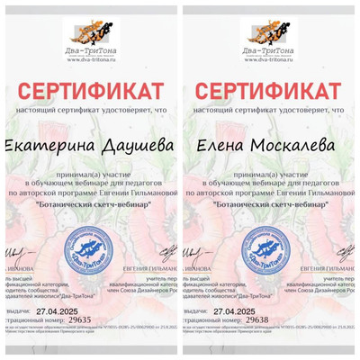 Педагоги Дворца творчества Москалева Е.В. и Даушева Е.В. приняли участие в обучающем вебинаре для педагогов по авторской программе Е.Гильмановой «Ботанический скетч-вебинар» (сообщество Два-ТриТона». | |
