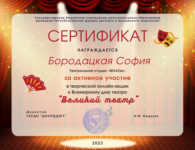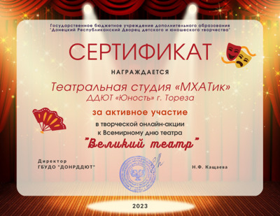В честь Всемирного дня театра Донецкий Республиканский Дворец детского и юношеского творчества организовал творческую онлайн-акцию «Великий театр». Для участия в акции надо было опубликовать на своих страницах в социальной сети «ВКонтакте» видеоролики театральных сценок, этюдов, миниатюр, постановок под хэштегом #Всемирный_день_театра_2023. В акции приняла участие театральная студия «МХАТик» (педагог Морозова Н.А.) и Бородацкая София. Все участники творческой онлайн-акции получили сертификаты за участие Донецкого Республиканского Дворца детского и юношеского творчества. Благодарим за участие в творческой онлайн-акции к Всемирному дню театра «Великий театр»! | |