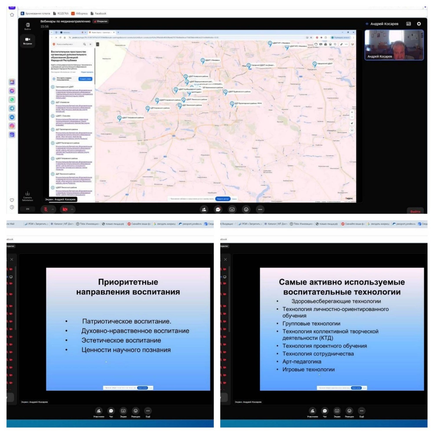 Формируем воспитательное пространство учреждений дополнительного образования с использованием новых подходов и инновационных решений. 22 мая 2025 года Донецкий Республиканский Дворец детского и юношеского творчества в рамках реализации программы работы инновационной площадки «Моделирование воспитательного пространства учреждения дополнительного образования в условиях обновления воспитательных практик, использования современных воспитательных технологий» провёл онлайн-встречу с директорами и методистами Дворцов, Домов, Центров детского творчества Донецкой Народной Республики. В ходе встречи были подведены итоги организационного этапа работы инновационной площадки, рассмотрены ближайшие перспективы деятельности, среди которых тематический выпуск «Портретной галереи педагогов дополнительного образования» - «Я - педагог – воспитатель», формирование «Электронной библиотеки воспитательных технологий», проведение методической выставки «Воспитательное пространство учреждения дополнительного образования - 2025». Главным событием встречи стала презентация «Интерактивной карты воспитательного пространства организаций дополнительного образования Донецкой Народной Республики», в которой представлены действующие воспитательные пространства Дворцов и Центров детского творчества. | |