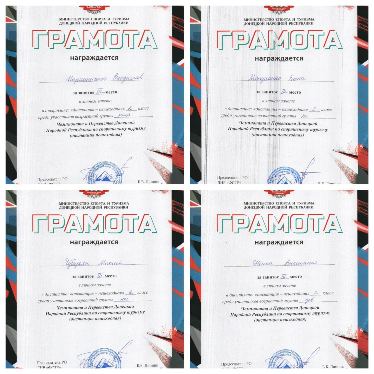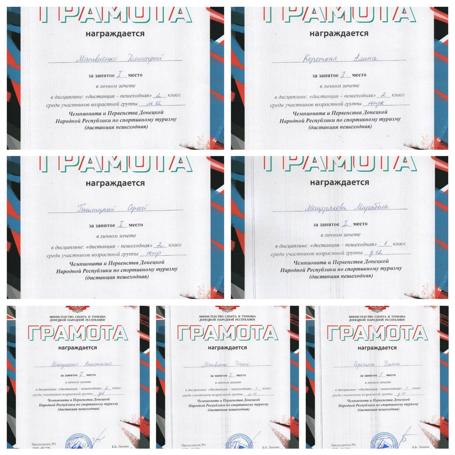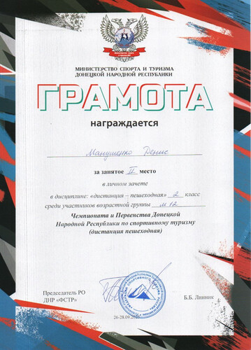 26.09 – 28.09.2025 состоялся Чемпионат и Первенство ДНР по спортивному туризму (дистанция пешеходная). В соревнованиях приняли участие спортсмены клуба «Пешеходный туризм» (педагог Короткая А.В.). Наши результаты – 7 первых, 1 второе и 4 третьих мест! 1 место – Матвиенко Денис (М-10), Серёгина Ульяна (Д-10), Манушенко Анастасия, Мещерякова Мирабела (Д-12), Гнилицкий Сергей, Короткая Алина, Матвиенко Дмитрий (М-12). 2 место - Манушенко Денис (М-12). 3 место – Шеина Анастасия, Чубарьян Михаил, Манушенко Елена, Мирошниченко Владислав. Поздравляем наших спортсменов с отличными результатами! | |