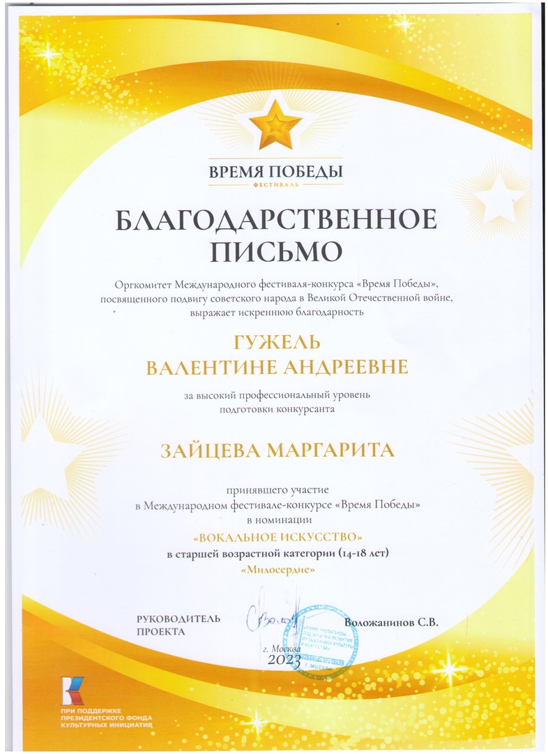 Патриотический творческий марафон фестиваль-конкурс «Время Победы» стал победителем первого конкурса на предоставление грантов Президента Российской Федерации на реализацию проектов в области культуры, искусства и креативных (творческих) индустрий в 2023 году в направлении «Мы вместе. Проекты, направленные на интеграцию Донбасса и освобожденных территорий в единое культурно-образовательное, просветительское и цивилизационное пространство». Проект получил высокие оценки экспертного совета, и в 2023 году реализуется при поддержке Президентского фонда культурных инициатив. | |