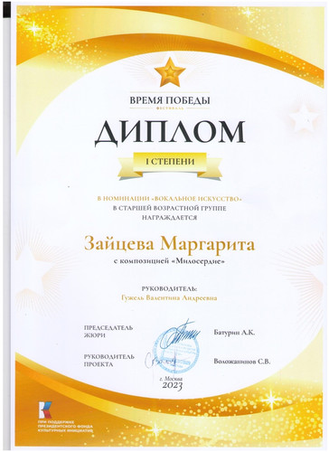 На конкурс принимались номера, посвященные подвигу советского народа в Великой Отечественной войне, событиям Великой Отечественной войны, Победе в Великой Отечественной войне. Маргарита прошла отборочный этап из 600 конкурсантов, стала участницей очного этапа в г. Москва и привезла диплом 1-ой степени!