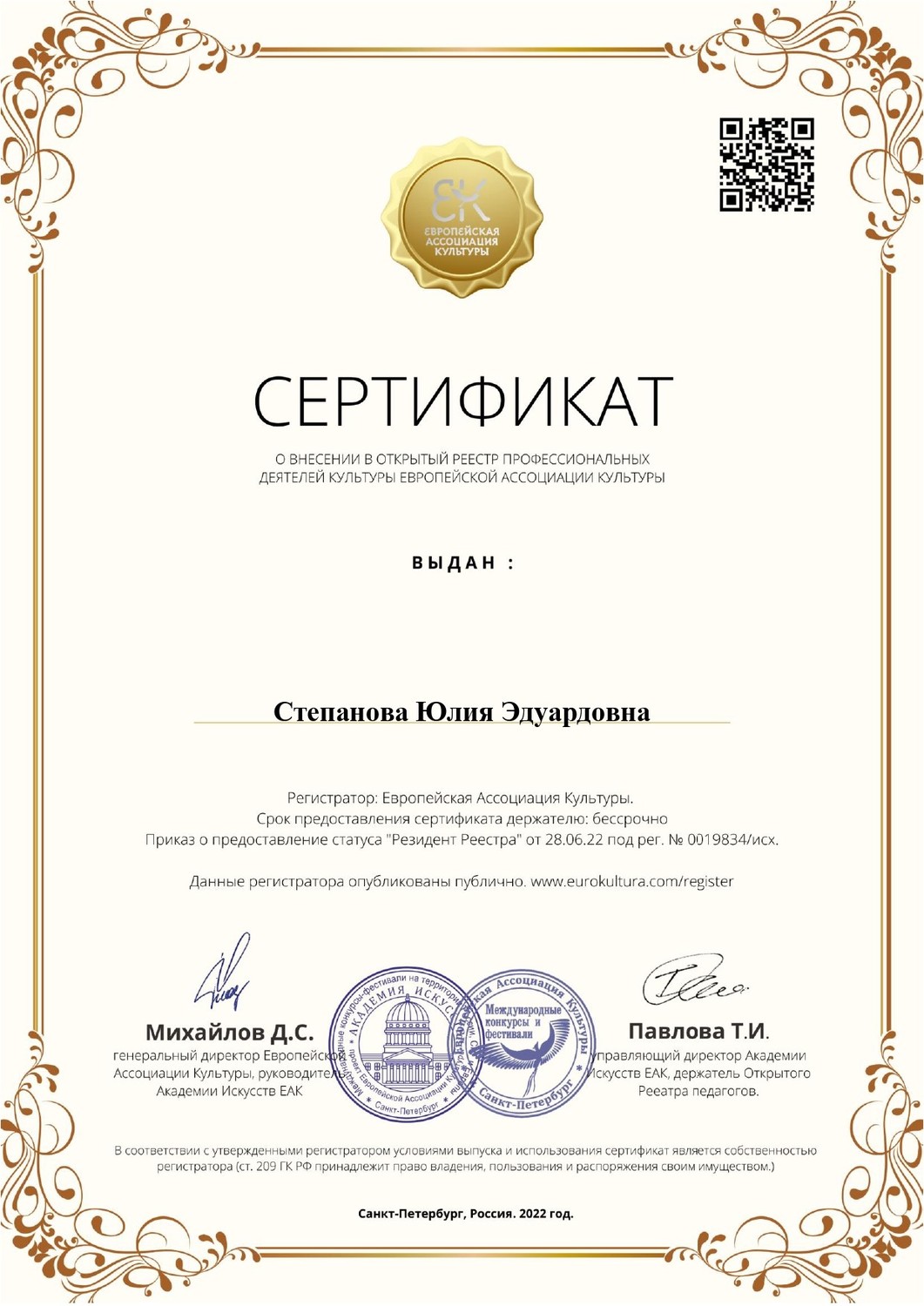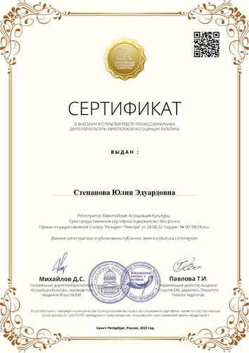 Педагоги МОДО «ДДЮТ «Юность» Даушева Е.В., Москалева Е.В., Цымбаленко И.О. и Степанова Ю.Э. получили сертификаты и статус «Резидент Реестра» профессиональных деятелей культуры Европейской Ассоциации Культуры (г. Санкт-Петербург). ПОЗДРАВЛЯЕМ! | |